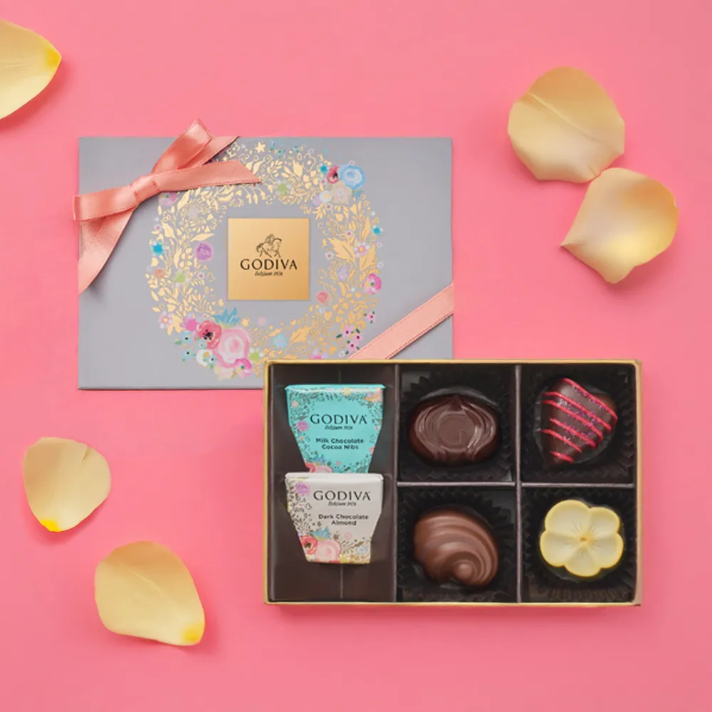 期間限定でこちらもお選びいただけます。 キュートに描かれた花々と金箔でブーケを表現したパッケージに、お花をイメージした限定チョコレートやカレなどを詰め合わせました。 ●ダークチョコレート ガナッシュ(1粒) ダークチョコレートのガナッシュをハート形のダークチョコレートで包み、レッドのラインで飾りました。カカオの風味が存分に味わえるひと粒です。 ●トルビヨン プラリネ(1粒) ゴディバ伝統のなめらかなヘーゼルナッツプラリネを、まろやかなミルクチョコレートで包みました。 ●カレ ミルクチョコレート カカオニブ(1枚) カリッとしたカカオニブの食感がアクセントになったミルクチョコレート。*カカオニブ4.5%使用。 ●カレ ダークチョコレート アーモンド(1枚) アーモンドの食感と香ばしさがアクセントになった、ダークチョコレート。 ●アーモンド バニラ(1粒) 味わい深いバニラアーモンドプラリネをお花形の淡い黄色のホワイトチョコレートシェルで包みました。まろやかな優しい美味しさが味わえます。 ●ヴォルプテ ノア 72(1粒) カカオ香る72%ダークチョコレートガナッシュを、ほろ苦いダークチョコレートでコーティング。 アレルゲン情報:乳成分・アーモンド・大豆