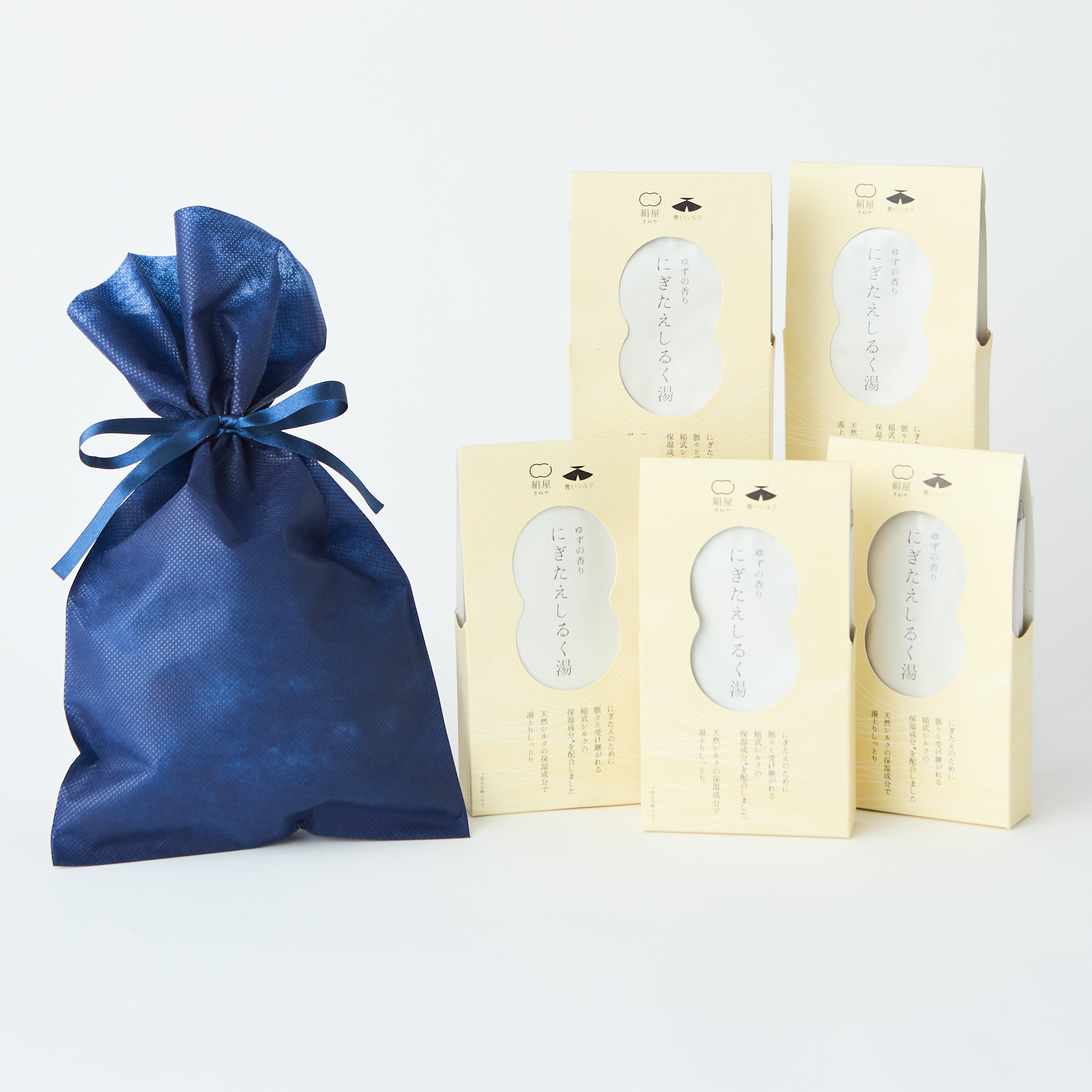 大口注文・法人のお問い合わせはこちら皇室の祭祀にも使用される愛知県豊田市稲武町の国産シルクの保湿成分を配合したゆずの上品な香りの入浴剤を5箱セットでお届け。 1箱3包入りの入浴剤なのでちょっとしたギフトにもおすすめです。4色から選べるラッピング付き!お客様ご自身でラッピングしてお配り用に。