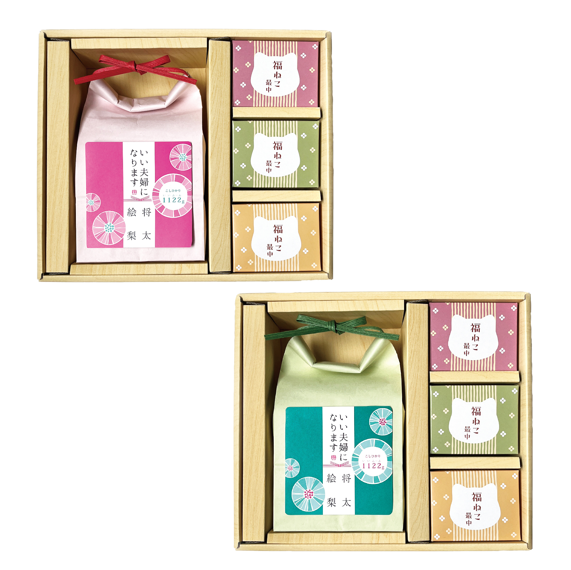大口注文・法人のお問い合わせはこちら袋に名入れができる1,122g(いい夫婦)の新潟県新潟産のお米と人気の猫型最中のセットで、結婚内祝いに最適なギフトです。 お二人のお名前を入れて、「いい夫婦になります」という気持ちを込めて贈ります。 米袋とラベルは、ピンクとグリーンから選べます。猫型最中の中身は、お茶漬け3種(梅・海苔・たらこ)と汁物3種(赤味噌汁・白味噌汁・お吸い物)の二つから選んでください。