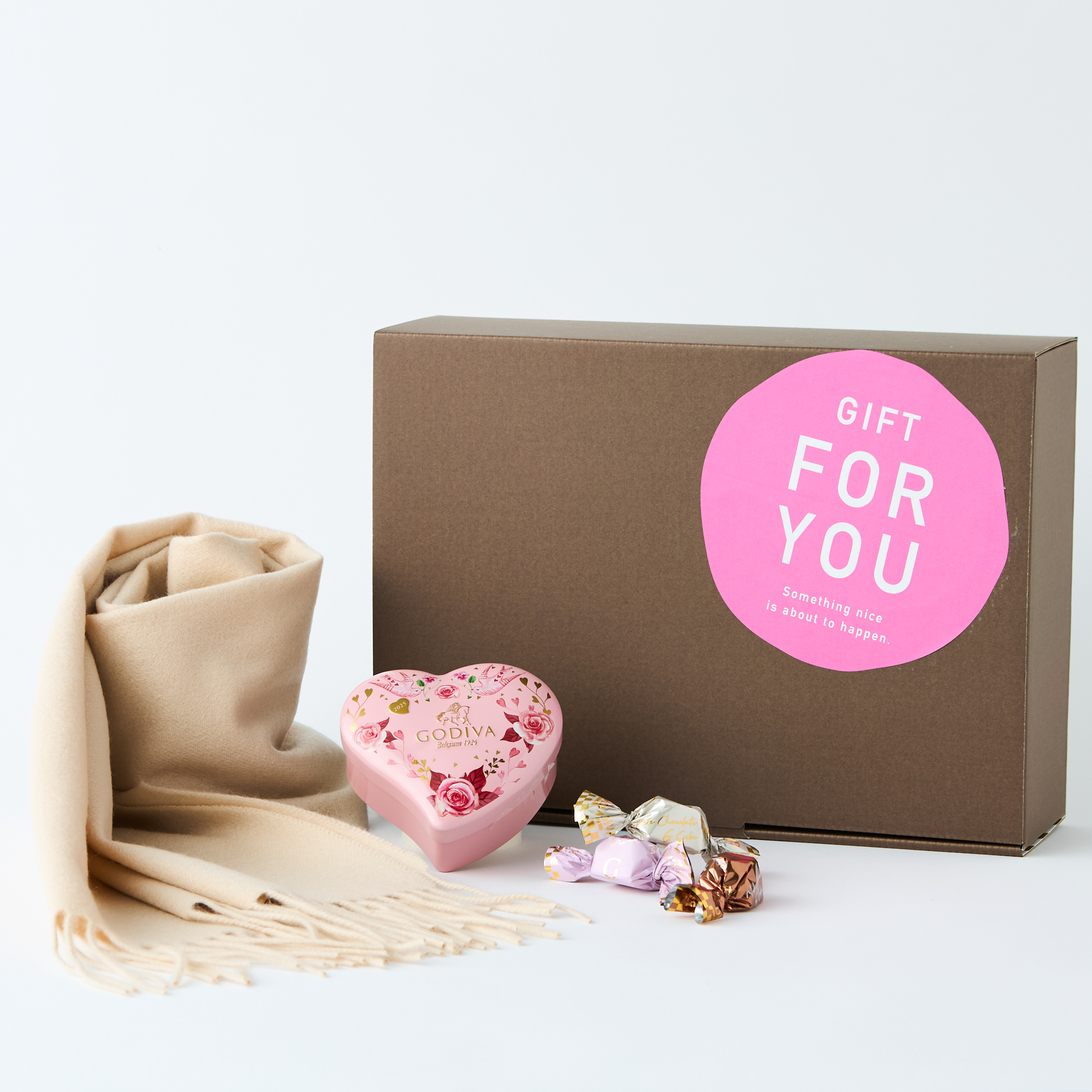 大口注文・法人のお問い合わせはこちら首元にボリュームを持たせたり、羽織るなど、巻き方次第で多彩なスタイルを楽しめるカシミヤ100%のマフラーと、かわいいハート缶にチョコレートを詰め込んだ世界で愛されるチョコレートブランド「GODIVA(ゴディバ)」 のチョコレートアソートメントをセットでお届けします。 バレンタインデーやホワイトデーなど、大切な方への冬ギフトにおすすめです。