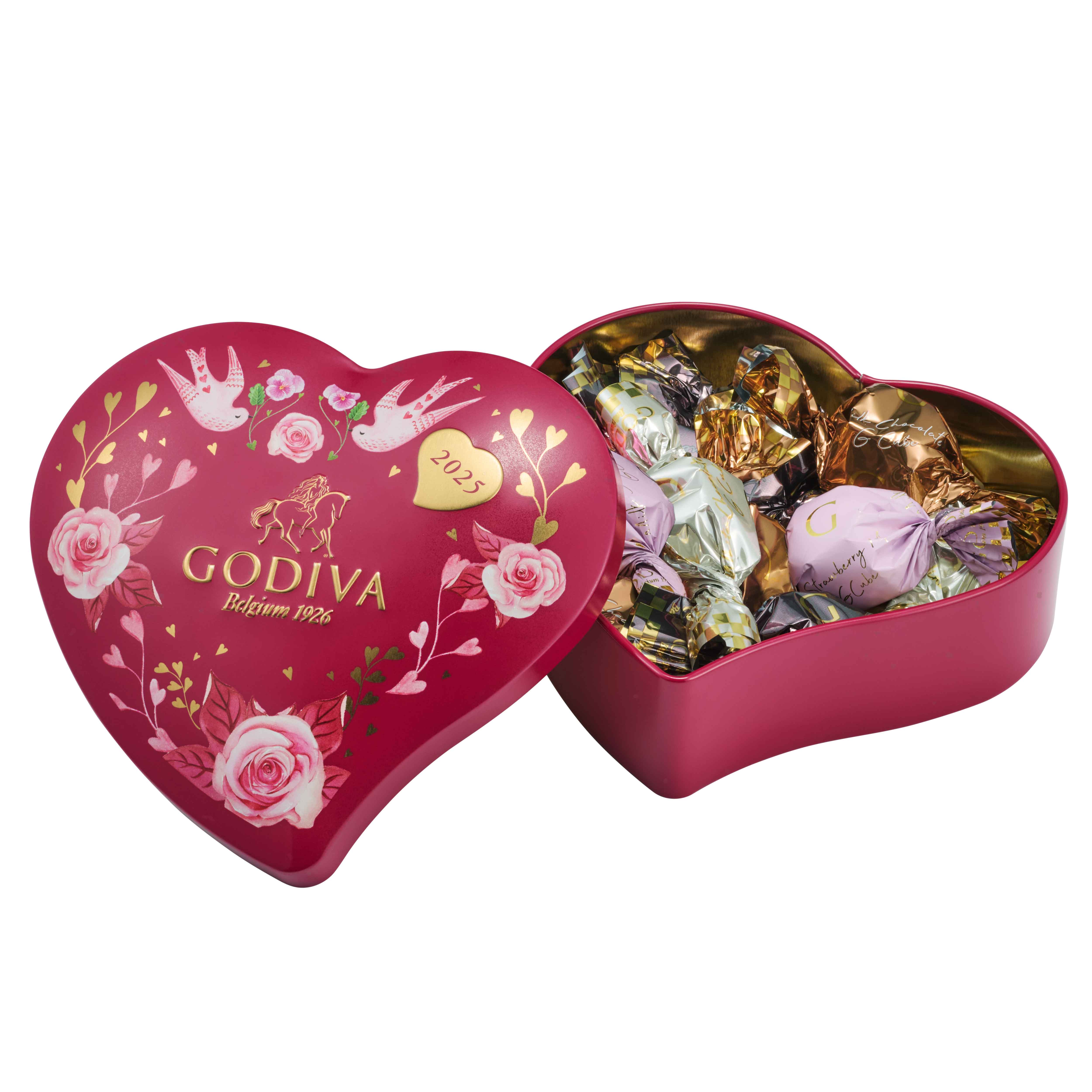 大切な人に「あなたがいる幸せ」を届ける日。一つひとつの想いを束ねて手渡す「ブーケ ド ゴディバ コレクション」。 幸せを運ぶ小鳥たちやキュートな花々などを描いたハート形の缶に、ホワイト、ミルク、ダーク、バレンタインから新登場のミルクストロベリームースのG キューブ チョコレートを詰め合わせました。