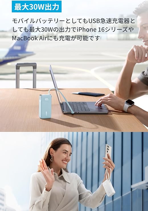 | 出力 | ・急速充電器として使用時 USB-C 出力 / USB-C 内蔵ケーブル出力 (単ポート利用時) :5V=3A / 9V=3A / 10V=2.25A / 15V=2A / 20V=1.5A (最大30W) 2ポート利用時合計最大出力:5V=3.6A (最大 18W) ・モバイルバッテリーとして使用時 USB-C 出力 / USB-C 内蔵ケーブル出力:5V=3A / 9V=3A / 10V=2.25A / 15V=2A / 20V=1.5A (最大 30W) 2ポート利用時合計最大出力:5V=3A (最大 15W) |