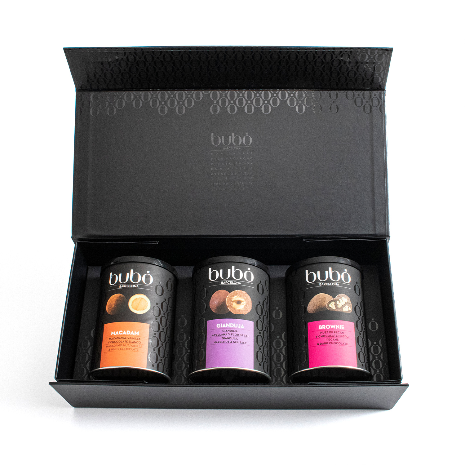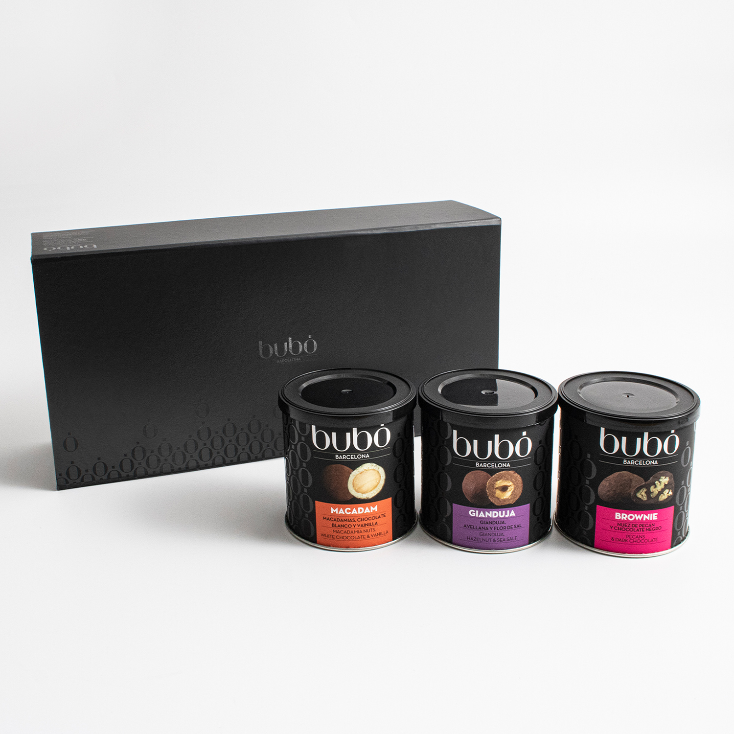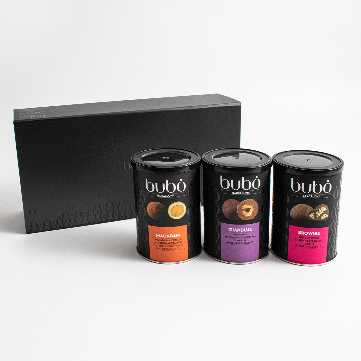 「bubó BARCELONA(ブボ・バルセロナ)」定番のチョコフルーツコレクション3個セットです。大粒のナッツをチョコレートでコーティング、人気の「マカダム」「ジャンドゥーヤ」「ブラウニー」の3種を詰め合わせました。大切な方への贈り物にいかがでしょうか。