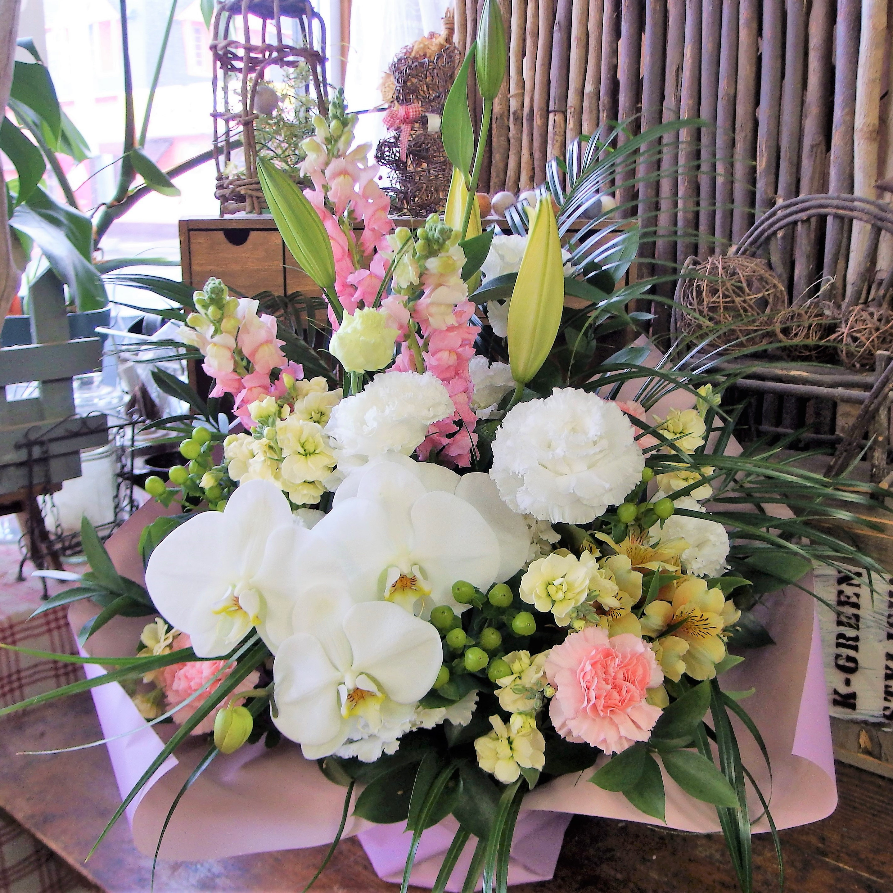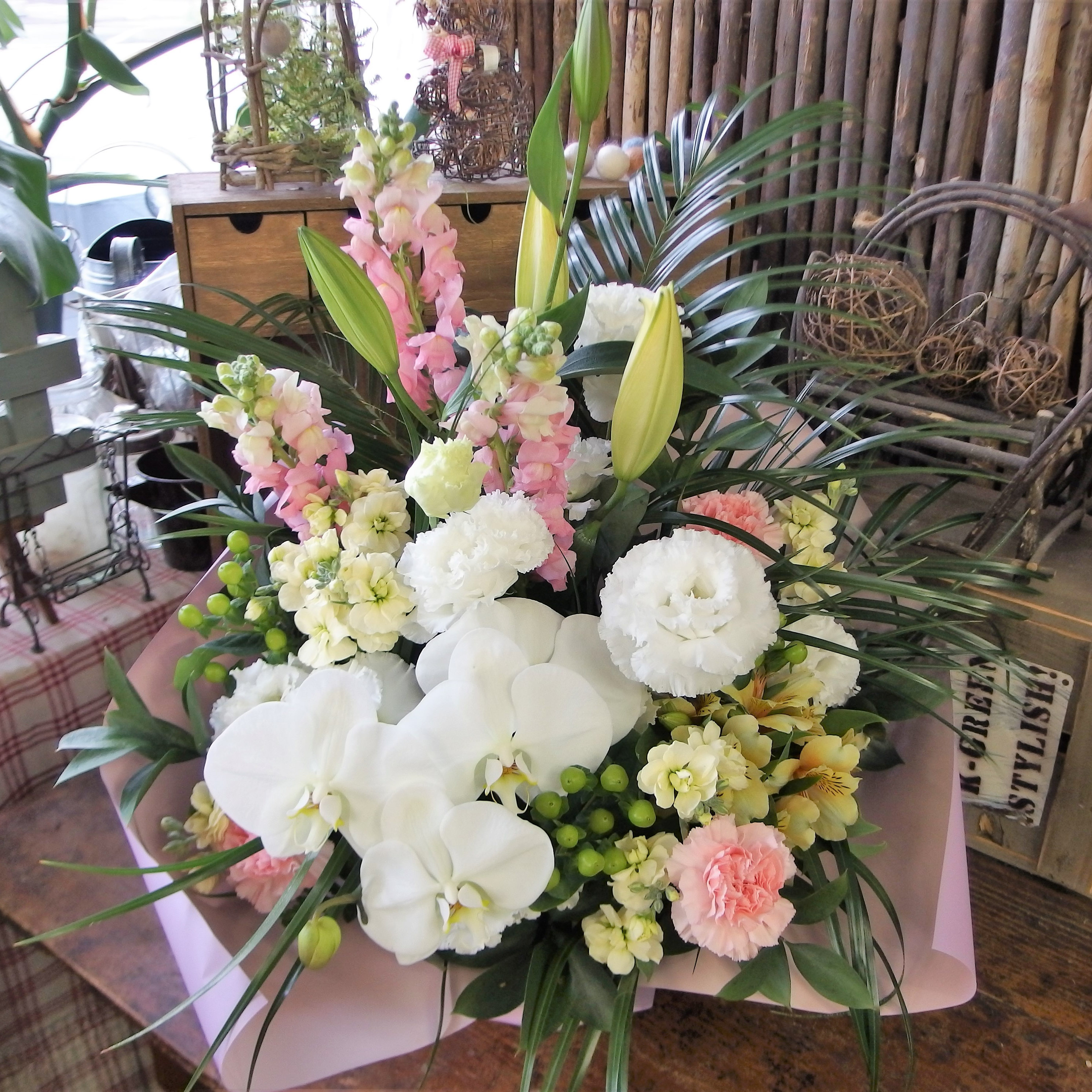 大口注文・法人のお問い合わせはこちら胡蝶蘭や豪華な印象のお花を使用した華やかなアレンジメントです。