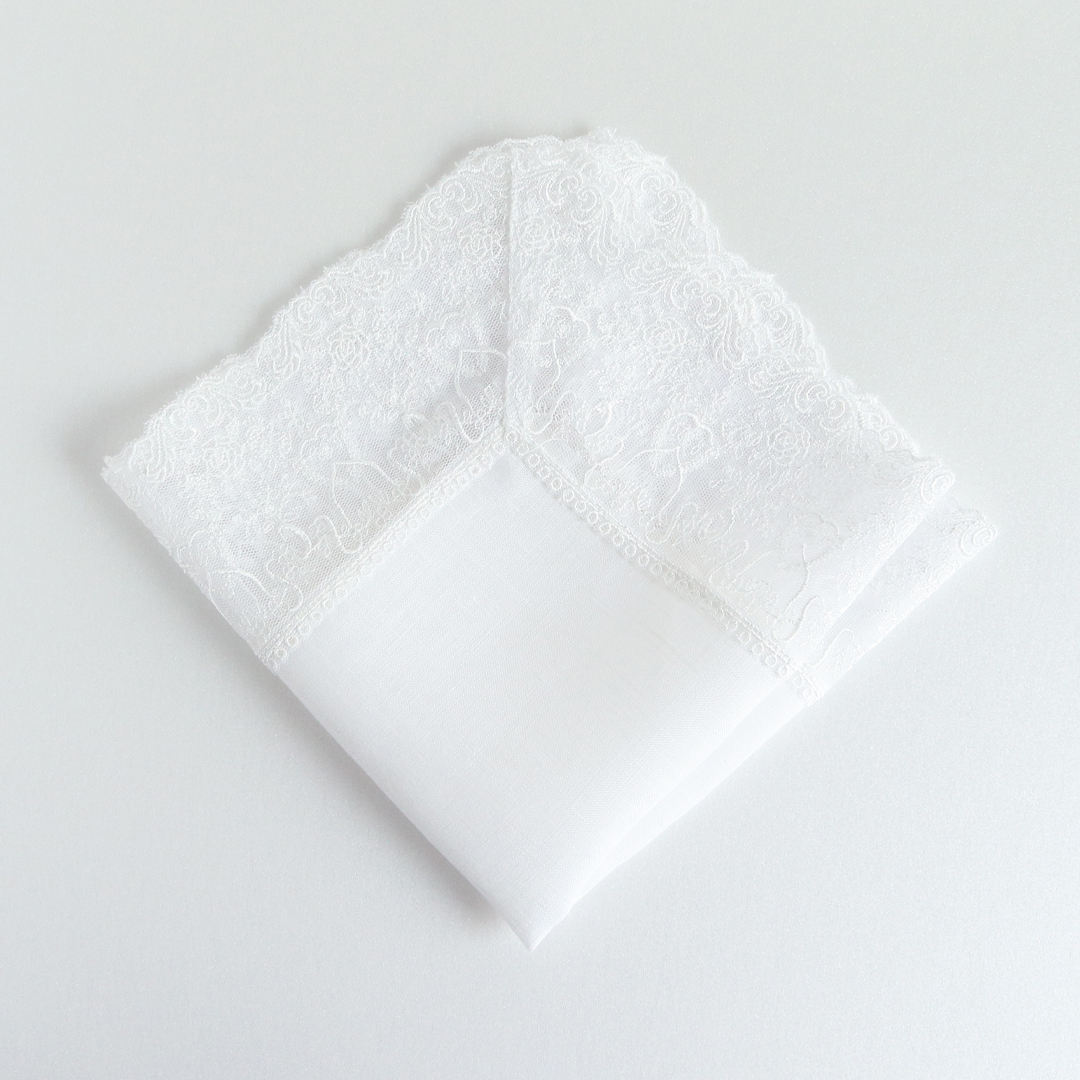 大口注文・法人のお問い合わせはこちらレースのひざ掛けハンカチは、レース店ならではの商品。レースへのあこがれ、品の良さ、すべてを詰め込んだアイテムです。 ヨーロッパ、18世紀〜19世紀ごろのシャンテリーレースの刺繍柄をアレンジし、オリジナルレースに仕上げました。 柔らかな曲線と伸び行く蔦の連続模様、なんとも緻密でクラシカル。見ているだけで、優雅でエレガントな気持ちにさせてくれる一品です。