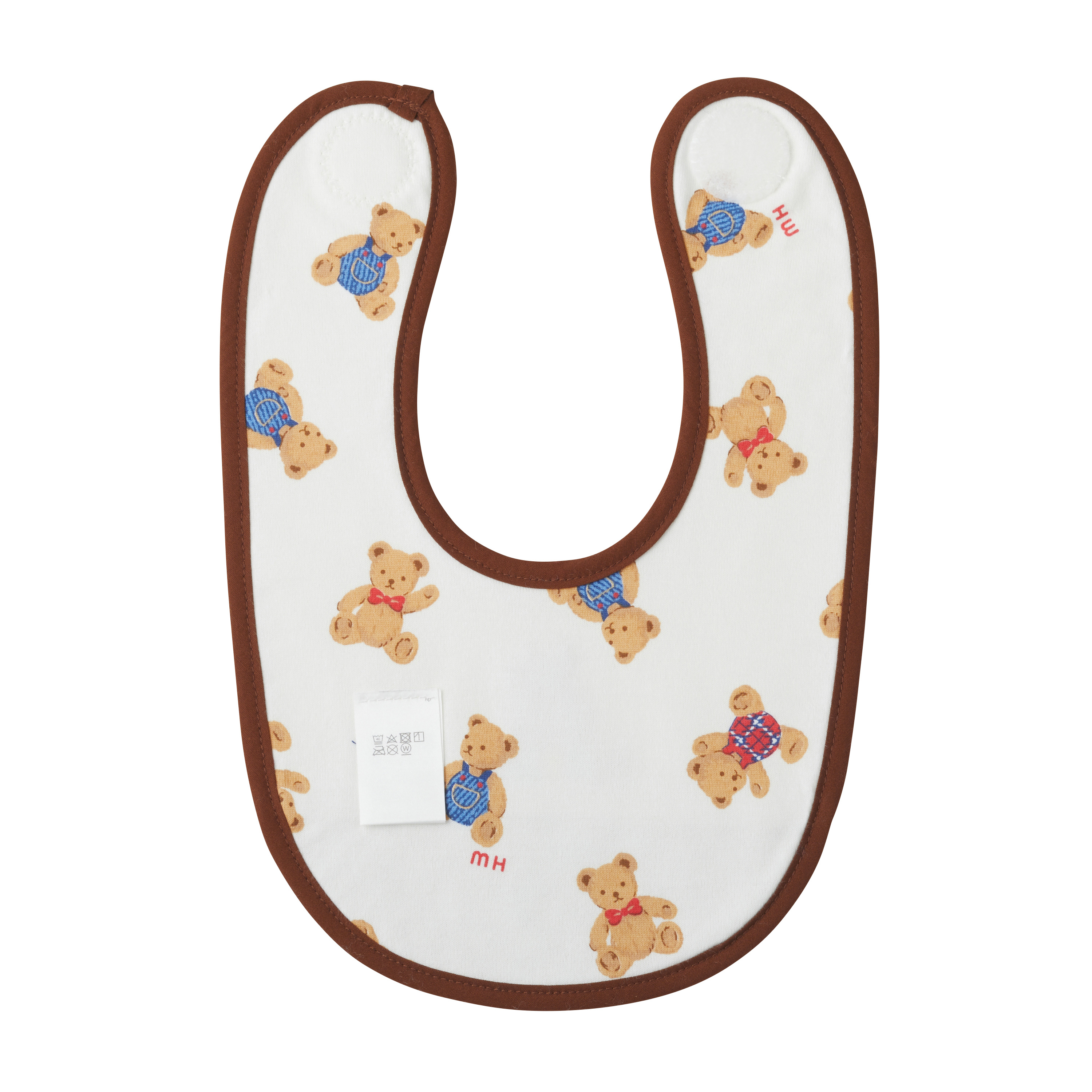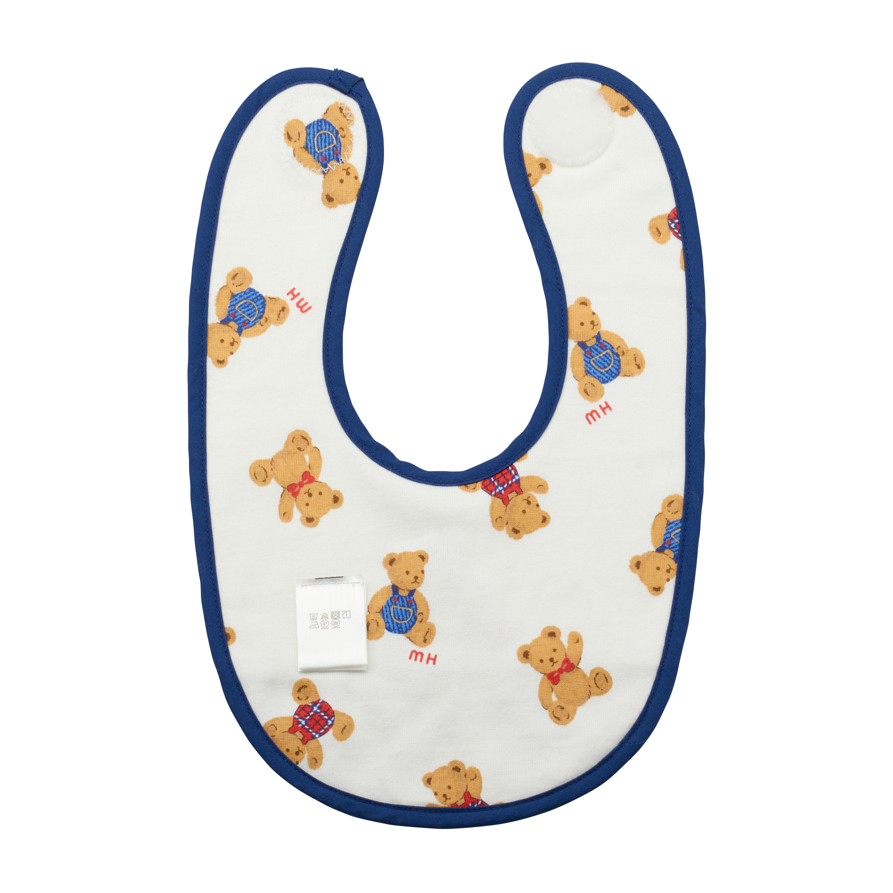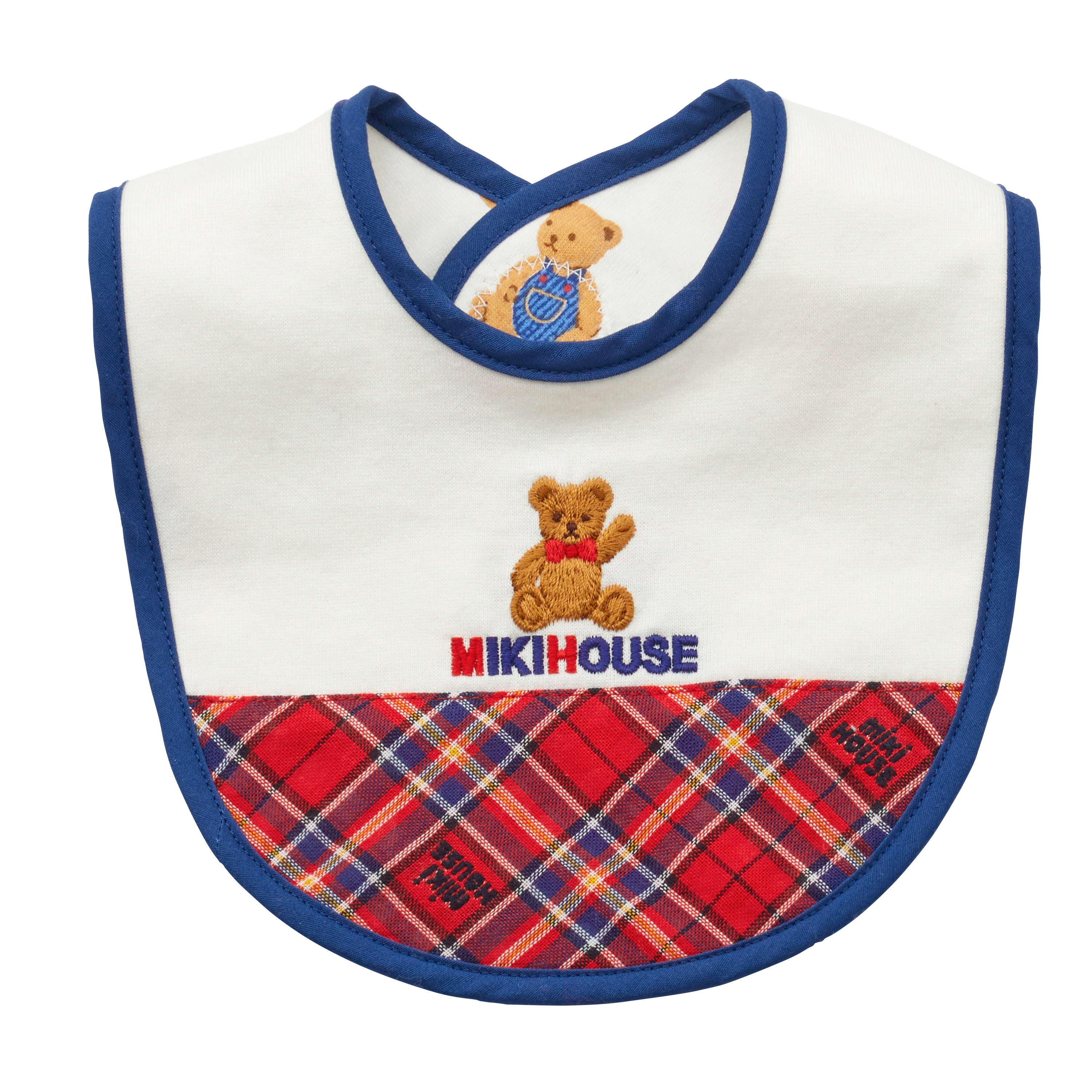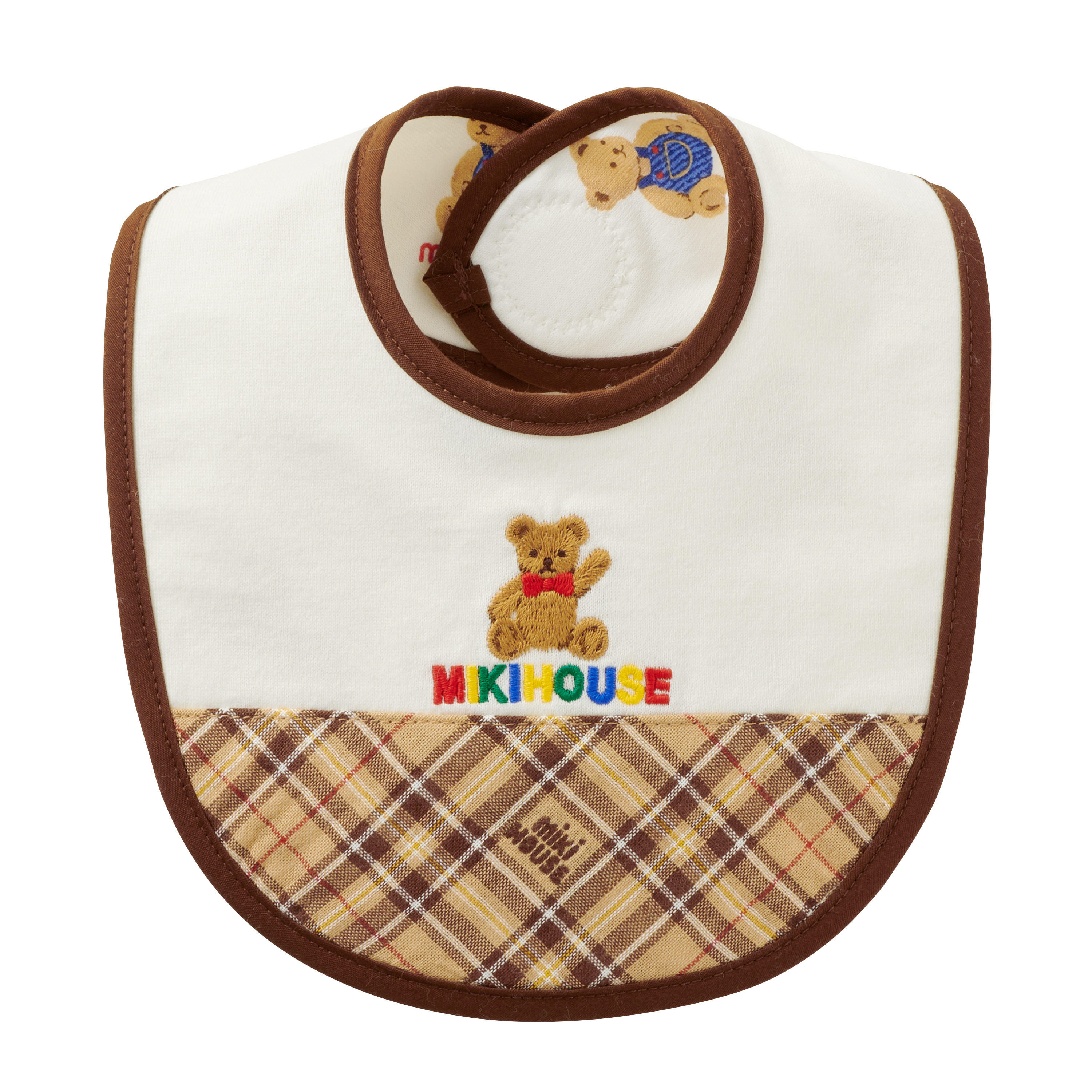 表面はチェック使いでかわいく。裏面はミキハウスベアの総柄プリントで、一枚で二度うれしいアイテムです。 お洋服に浸みないように中層には撥水シートが入っており、面ファスナーで簡単に着脱が可能です。