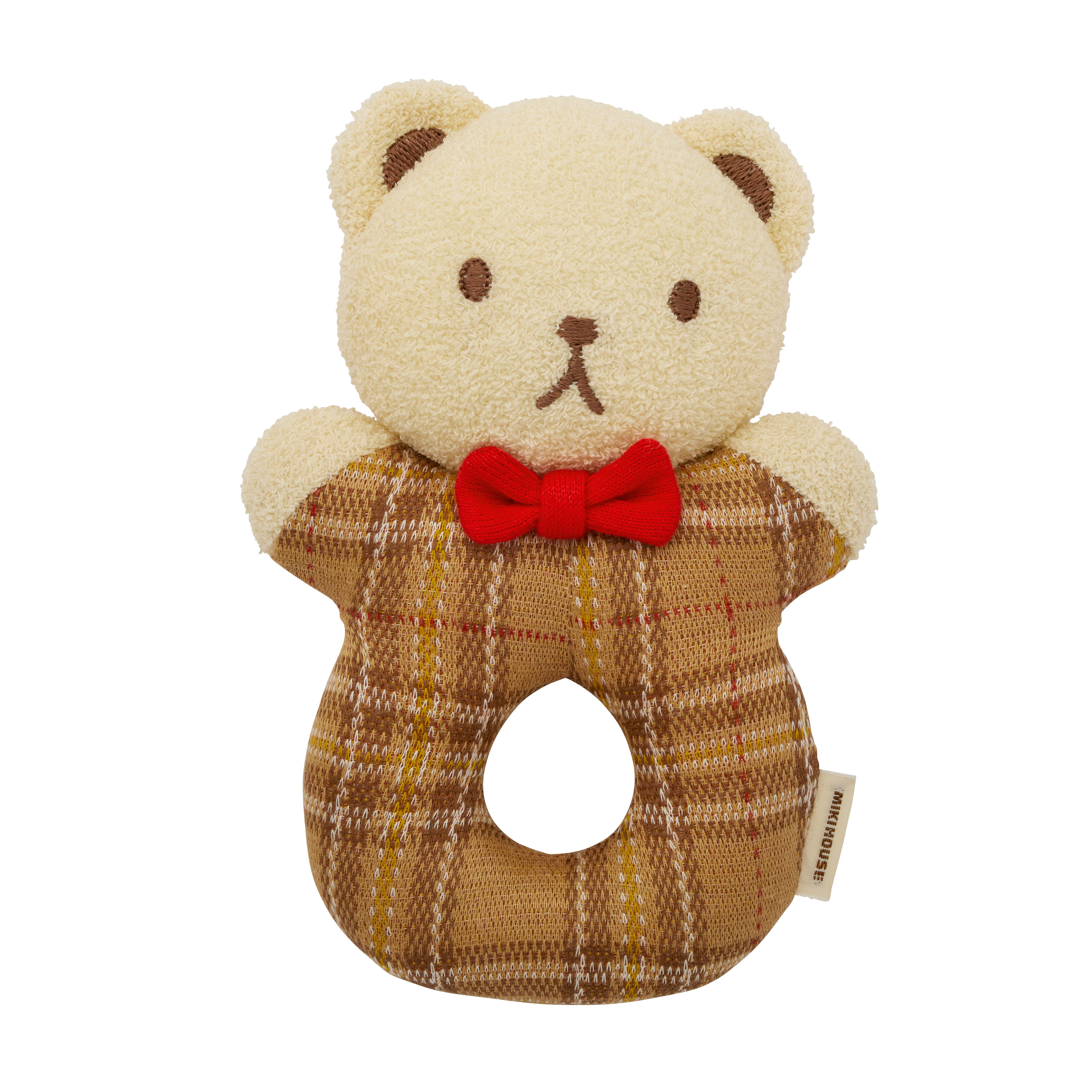 チェック使いがかわいい表面に、裏面はベアの総柄プリントのリバーシブル仕様スタイと、どうぶつモチーフがかわいいチェックラトルのセットです。おしゃれなギフトボックスに入れてお届け。出産祝いや小さなお子様への贈り物にいかがでしょうか。