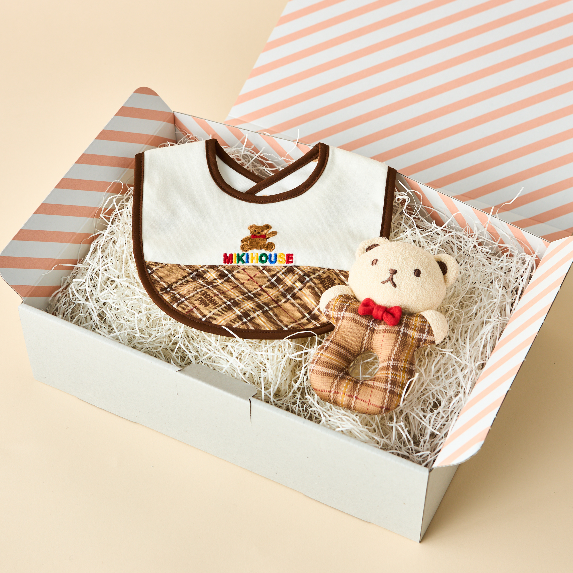 大口注文・法人のお問い合わせはこちらチェック使いがかわいい表面に、裏面はベアの総柄プリントで、一枚で二度うれしいスタイと、丸い持ち手で赤ちゃんの小さな手でも握りやすいどうぶつモチーフのかわいいチェックラトルをセットでお届けします。 おしゃれなギフトボックスに入っているので、ご自身のお子様へはもちろん、ご友人ご親戚への出産祝いにもおすすめです。