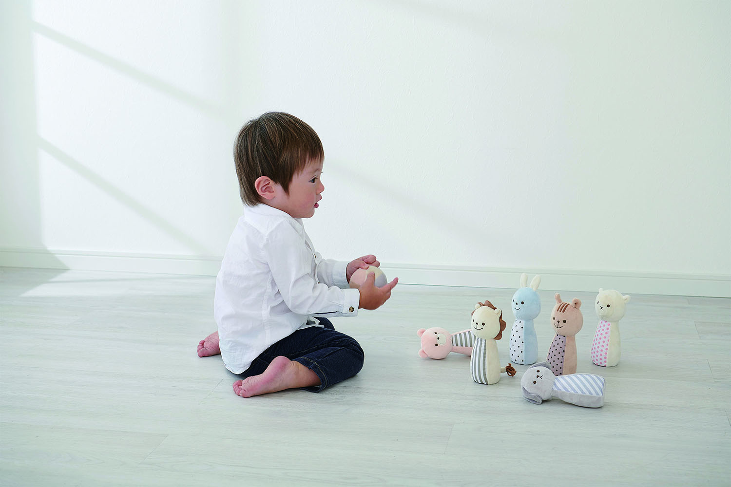 表情豊かなかわいい動物たち。ボールを転がして動物さんのピンを倒すと、中の鈴が優しく鳴ります。 ふわふわと優しい素材と柔らかな色彩の布おもちゃなので、ご出産祝いやファーストトイにぴったりです。 「狙ってボールを投げる→ピンにあたる→ピンが倒れる」といった流れで、集中力を養います。ピンを倒したときの達成感も味わえます。 ボウリングあそび以外にも、ラトルやごっこあそびができるので、親子やごきょうだい、お友達とコミュニケーション能力も楽しく育めます。 お子さまのファーストトイやご出産祝いにおすすめです。