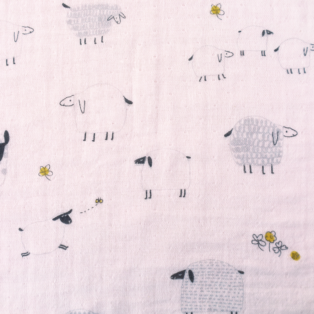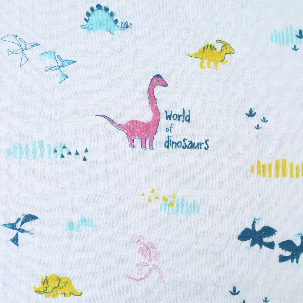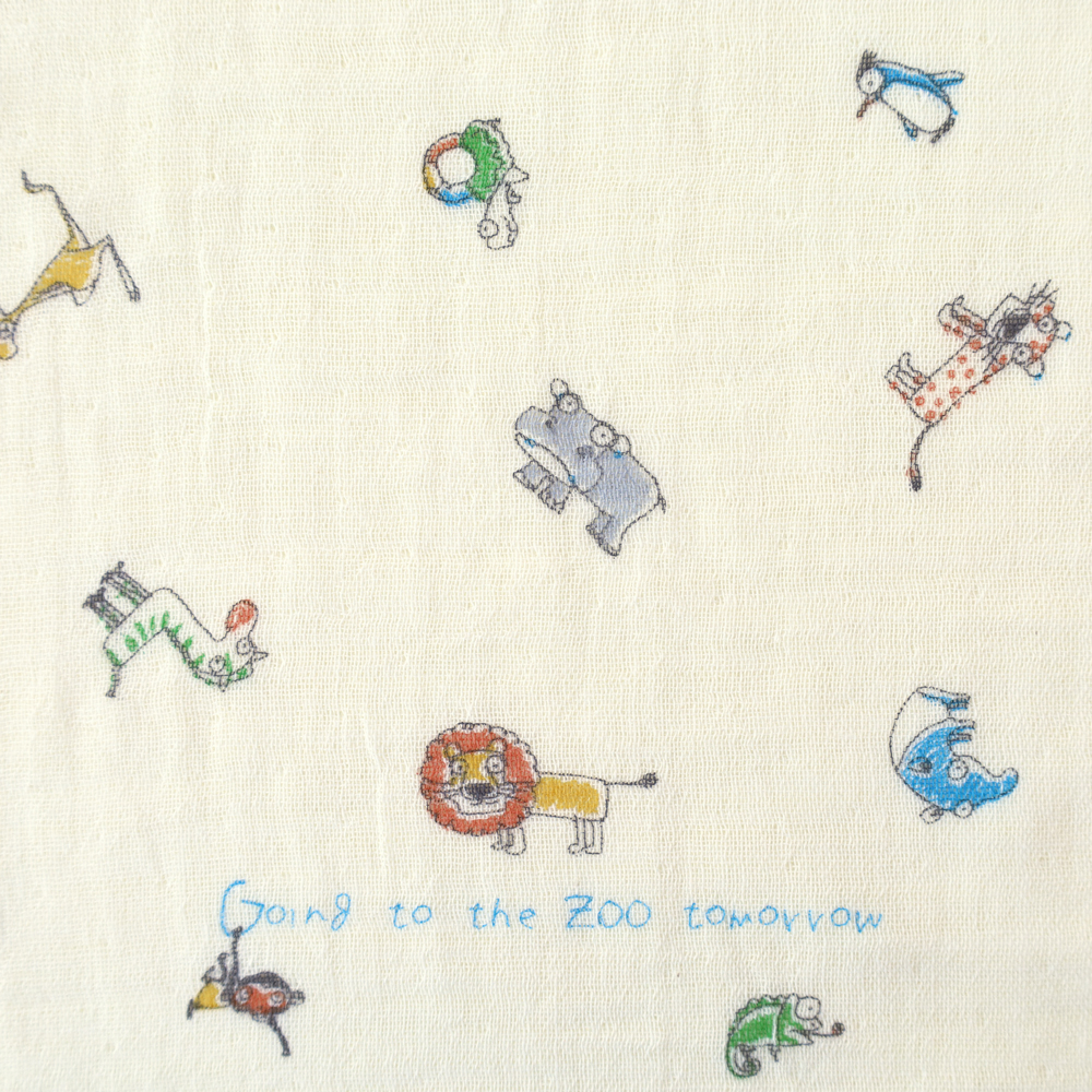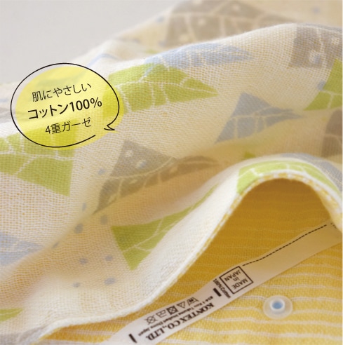 表は手書き風プリントと裏はシンプルなボーダー。 両面どちらもやわらかく、吸水性のよいコットン100%の2重ガーゼを合わせた4重ガーゼとなっています。
