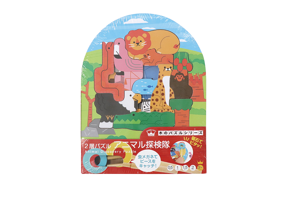 | 2層パズルアニマル探検隊 | ◼︎商品本体サイズ:幅265mm・奥行275mm・高さ15mm ◼︎商品本体重量:550g ◼︎パッケージ内同梱物:台紙 ◼︎パッケージ外装:シュリンク ◼︎パッケージサイズ:幅265mm・奥行340mm・高さ20mm ◼︎パッケージ全体重量:600g ◼︎製造国 インドネシア ◼︎原材料・素材・材質:天然木化粧合板、天然木、磁石 |