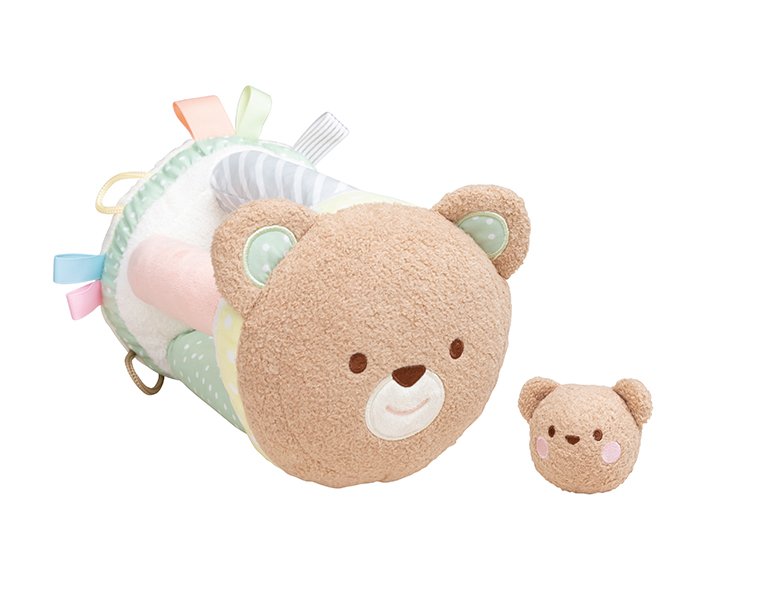 かわいいくまさん親子の布ラトル。3種類の音あそび、リボンタグ、ミラーあそび、ボールの出し入れあそび、ころころあそびなど赤ちゃんの大好きな遊びがいっぱい!にっこり笑顔のくまさんは表情の認識にも。 ご出産祝いやファーストトイにぴったりな布おもちゃです。 ●対象年齢:6ヶ月~