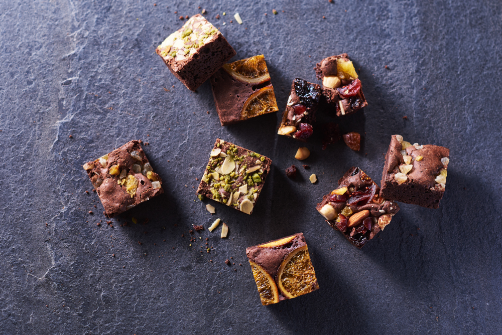 濃厚なチョコレートの生地に、香ばしいナッツや甘酸っぱいフルーツをトッピング。ピスタチオとアーモンド、ごろっとしたパイナップルやネーブル、たっぷりのドライフルーツとナッツ…。おいしさをぎゅっと詰め込んだキューブが、お口に小さなしあわせをお届けします。