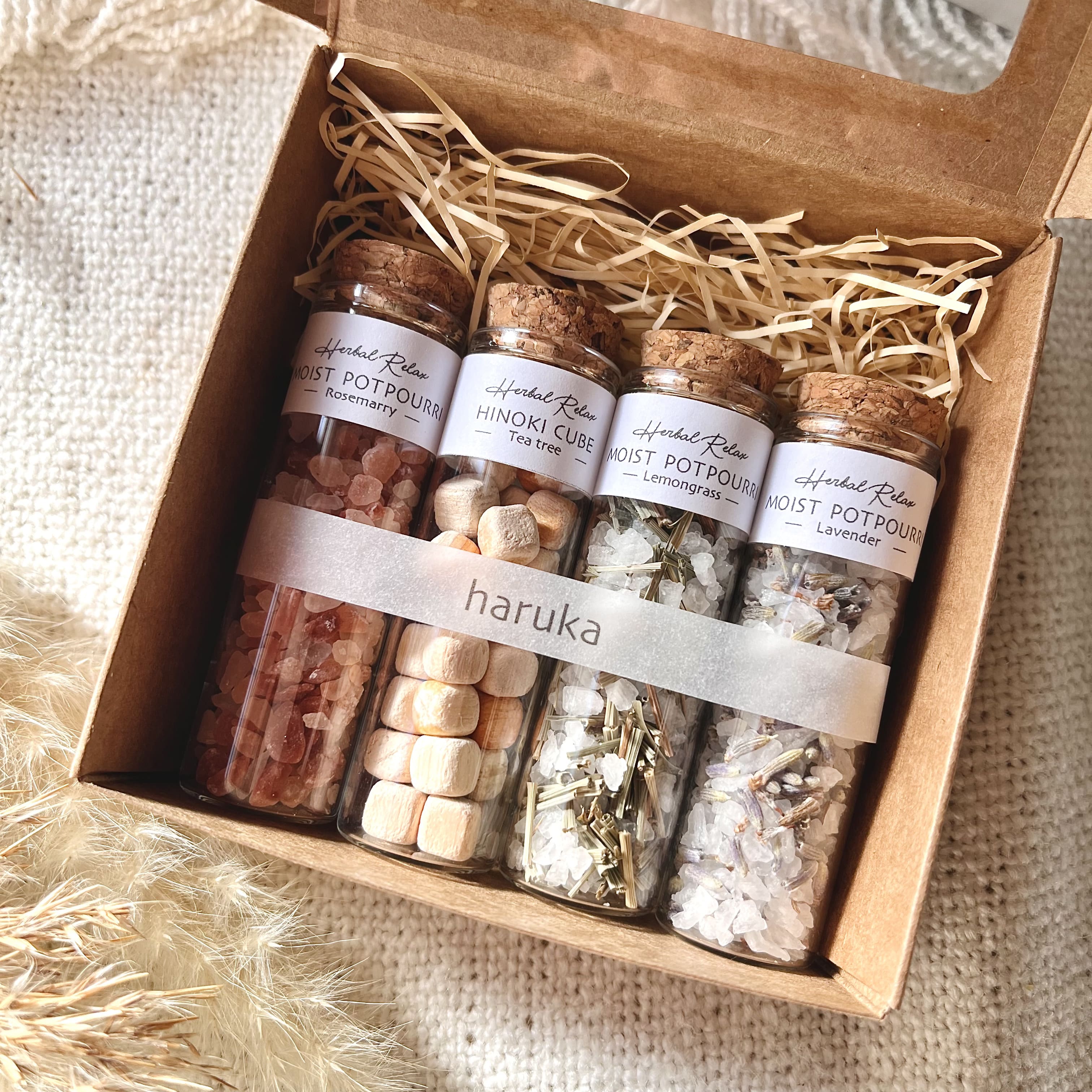 4種類のアロマの香りがsetになった《nanakamadoモイストポプリ&ヒノキキューブset》ヒマラヤピンクソルト、アトランティックソルト、ヒノキキューブの中に香りやハーブ(ドライフラワー)を詰め込みました。おしゃれなフレグランスアイテムです。