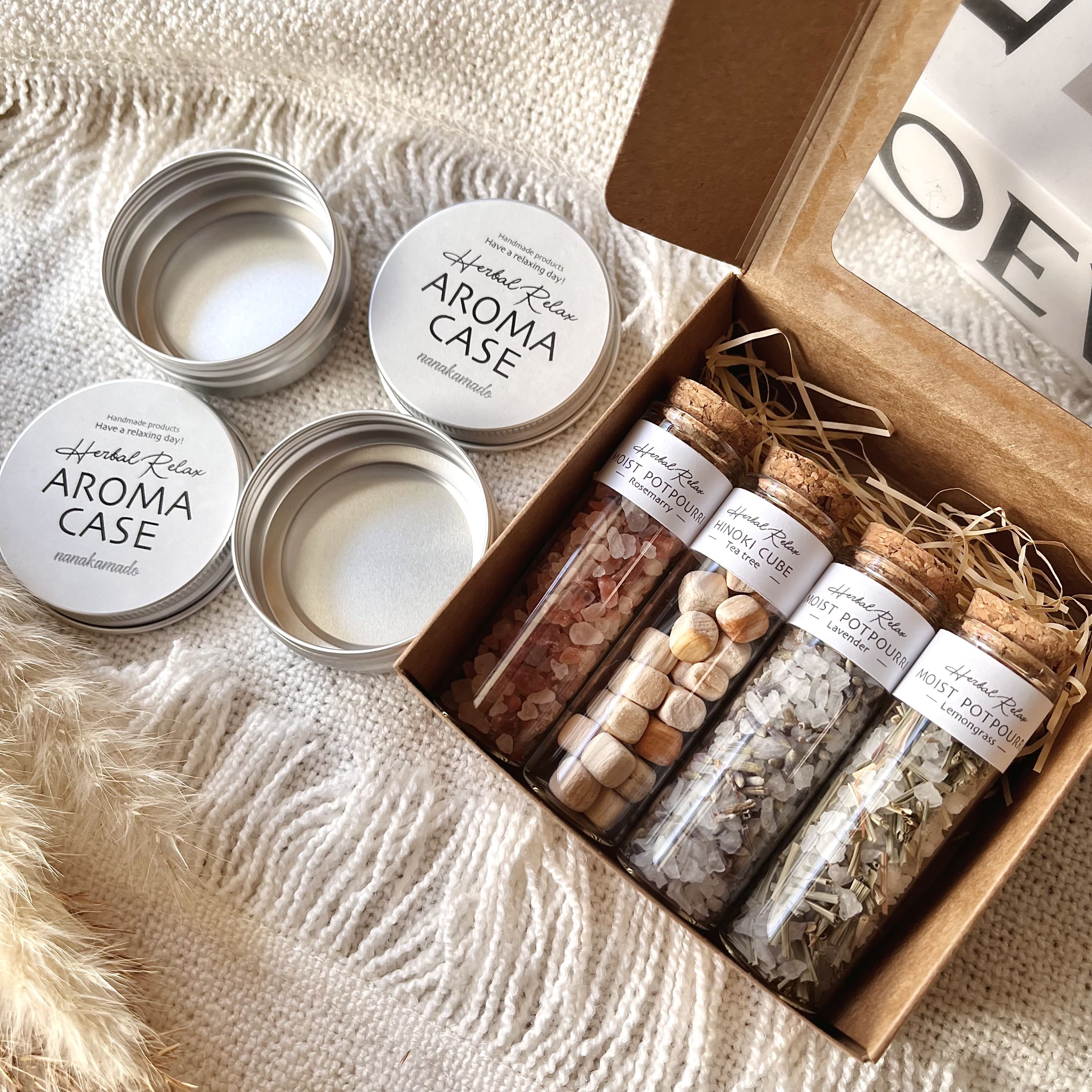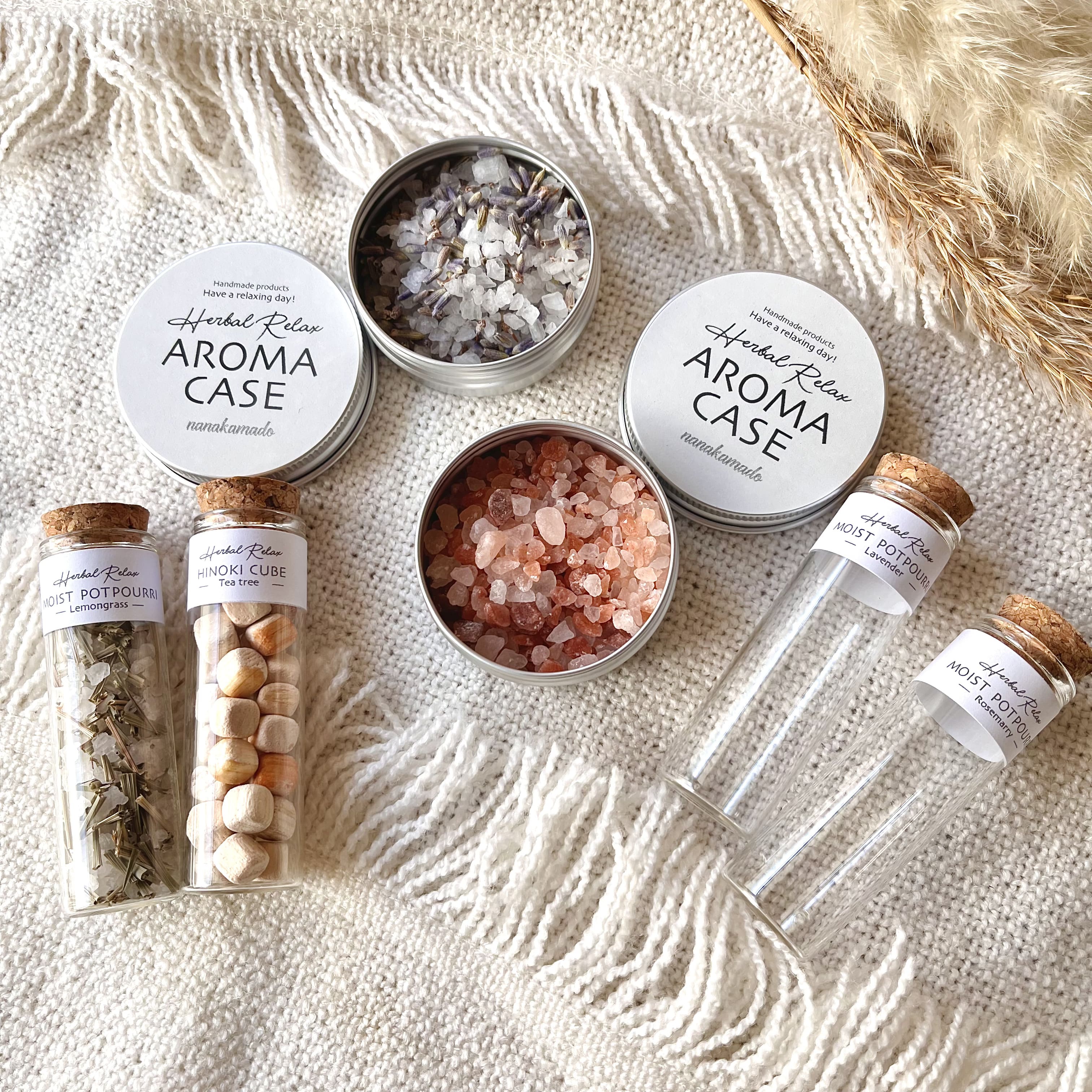 | 素材/繊維 | ●モイストポプリ×3 ・ヒマラヤピンクソルト×ローズマリーの香り(精油) ・アトランティックソルト×ラベンダーの香り(精油) ・アトランティックソルト×レモングラスの香り(精油) 【材料】 ・パキスタン産ヒマラヤピンクソルト(ピンク系) ・南アフリカ産アトランティックソルト(白系) ・ハーブ(ドライフラワー) ※ ヒマラヤピンクソルトにはハーブ(ドライフラワー)入っていません。 ・アロマ精油 ●ヒノキキューブ×1 ・ヒノキキューブ×ティートリーの香り(精油) 【材料】 木材(ヒノキ・国産) 粒自体はほんのりひのきの香りがします。ティートリーのエッセンシャルオイル(精油)を染み込ませています。香りが弱くなってきましたら、お手持ちのエッセンシャルオイル(精油)を数滴垂らして、香りをお楽しみください。 ※ ヒノキキューブにはハーブ(ドライフラワー)入っていません。 ●nanakamadoアロマケース×2コ 【材料】アルミニウム缶 |