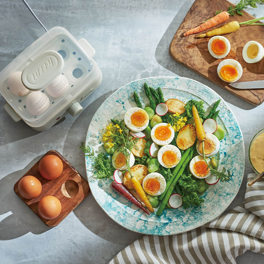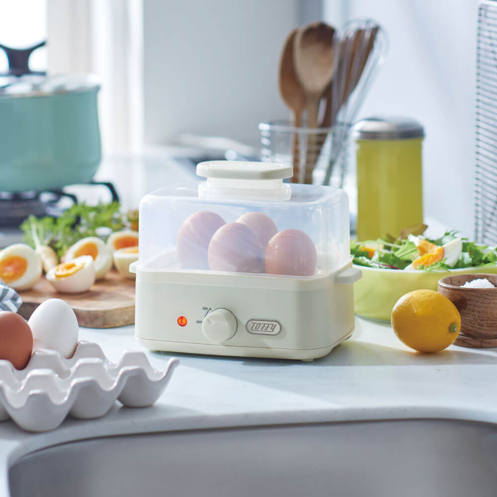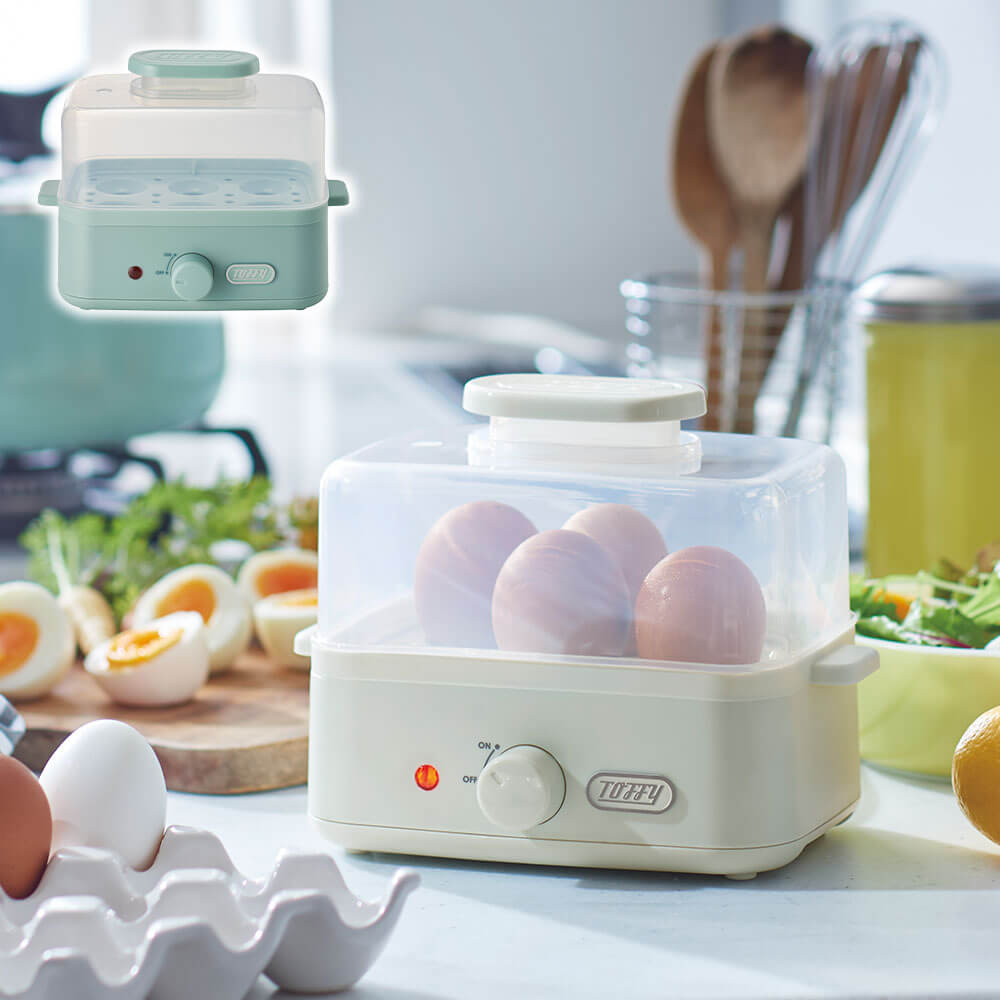 放っておくだけで半熟から固ゆでまでお好みの固さのゆで卵がつくれるエッグスチーマーです。最大6個の卵を調理可能で、お鍋いらずの簡単操作。コンパクトなサイズ感なので、キッチンや食卓でもお使いいただけます。