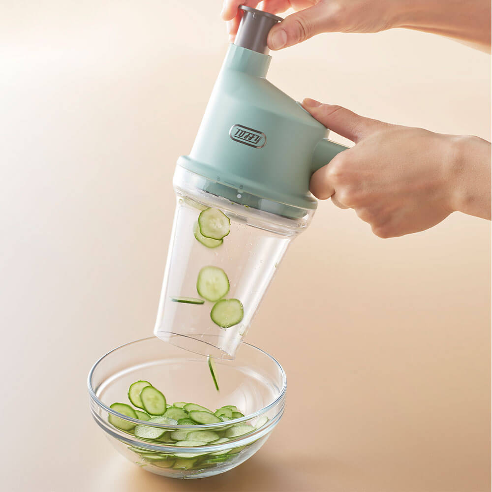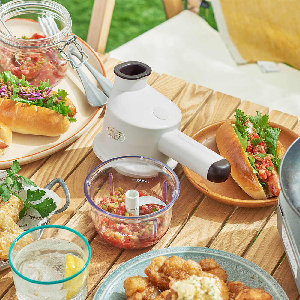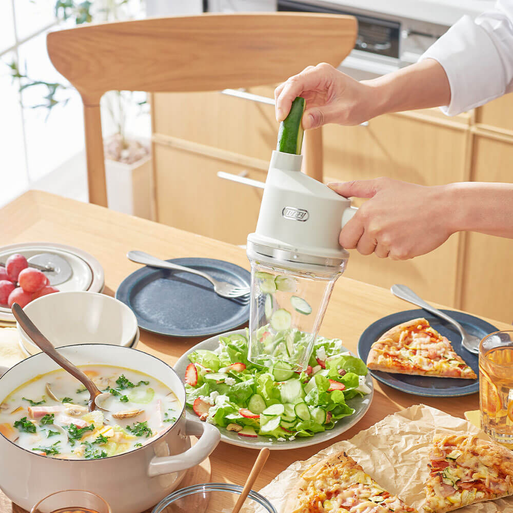 大口注文・法人のお問い合わせはこちらスライサーとチョッパーの2WAY仕様!包丁やまな板いらずで簡単・時短調理! ワンプッシュでらくらく操作。充電式でコードレスだから、場所を選ばず使用可能です。