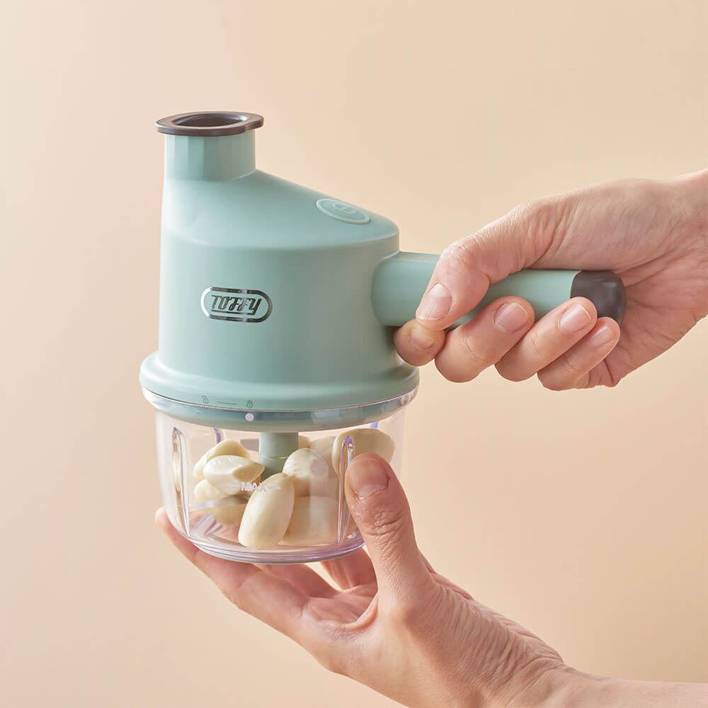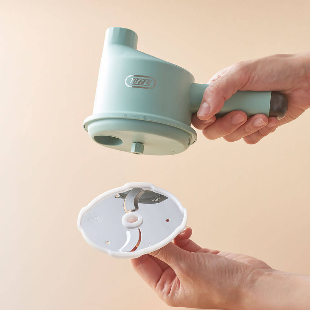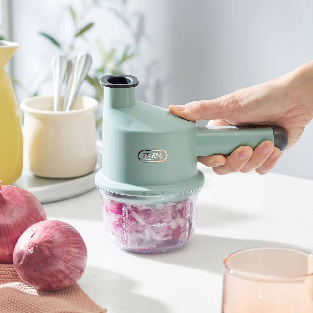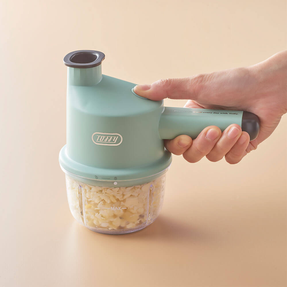 大口注文・法人のお問い合わせはこちらスライサーとチョッパーの2WAY仕様!包丁やまな板いらずで簡単・時短調理! ワンプッシュでらくらく操作。充電式でコードレスだから、場所を選ばず使用可能です。