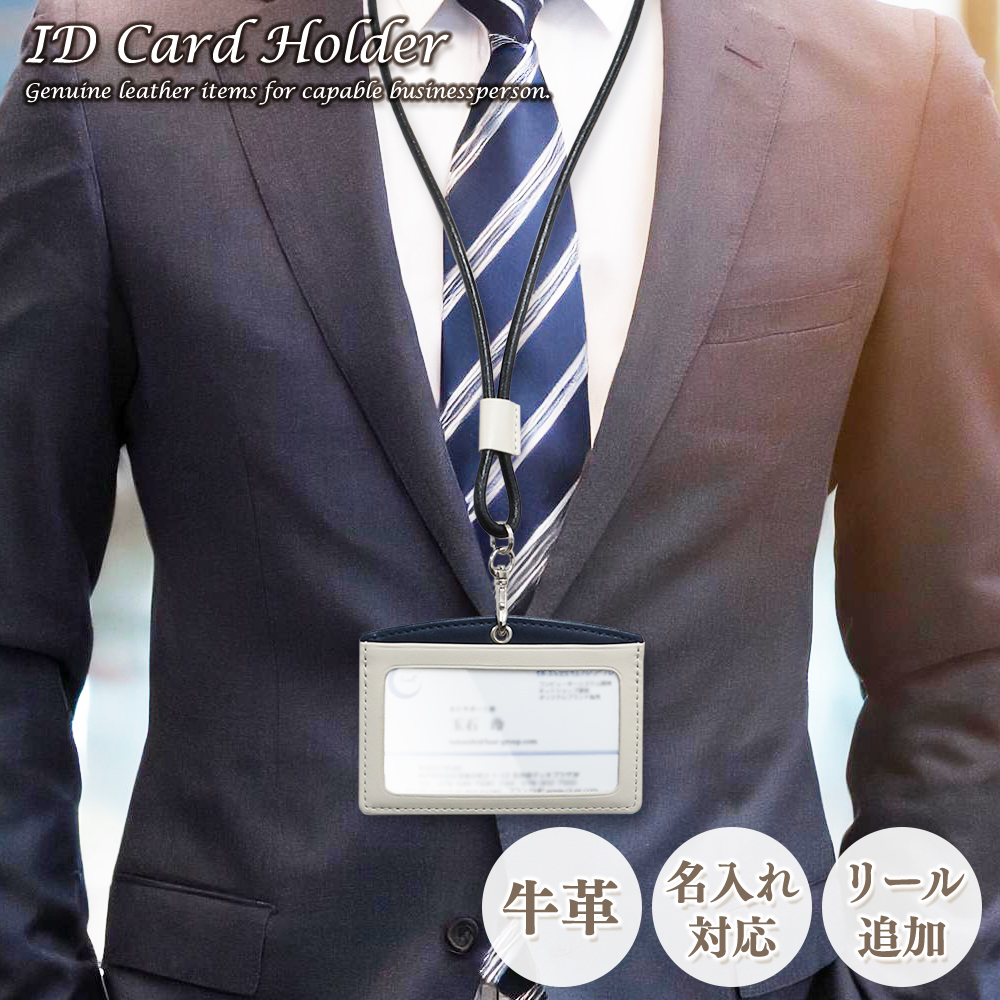 ビジネスシーンでの胸元を彩るアイテム、ネックストラップまで牛革製のIDカードホルダー“Simple版”です。従来品よりポケットの数を減らし、シンプルなデザインにすることでお求めやすくなりました。有料でリールありに変更もできるので、用途に合ったタイプでご購入いただけます。