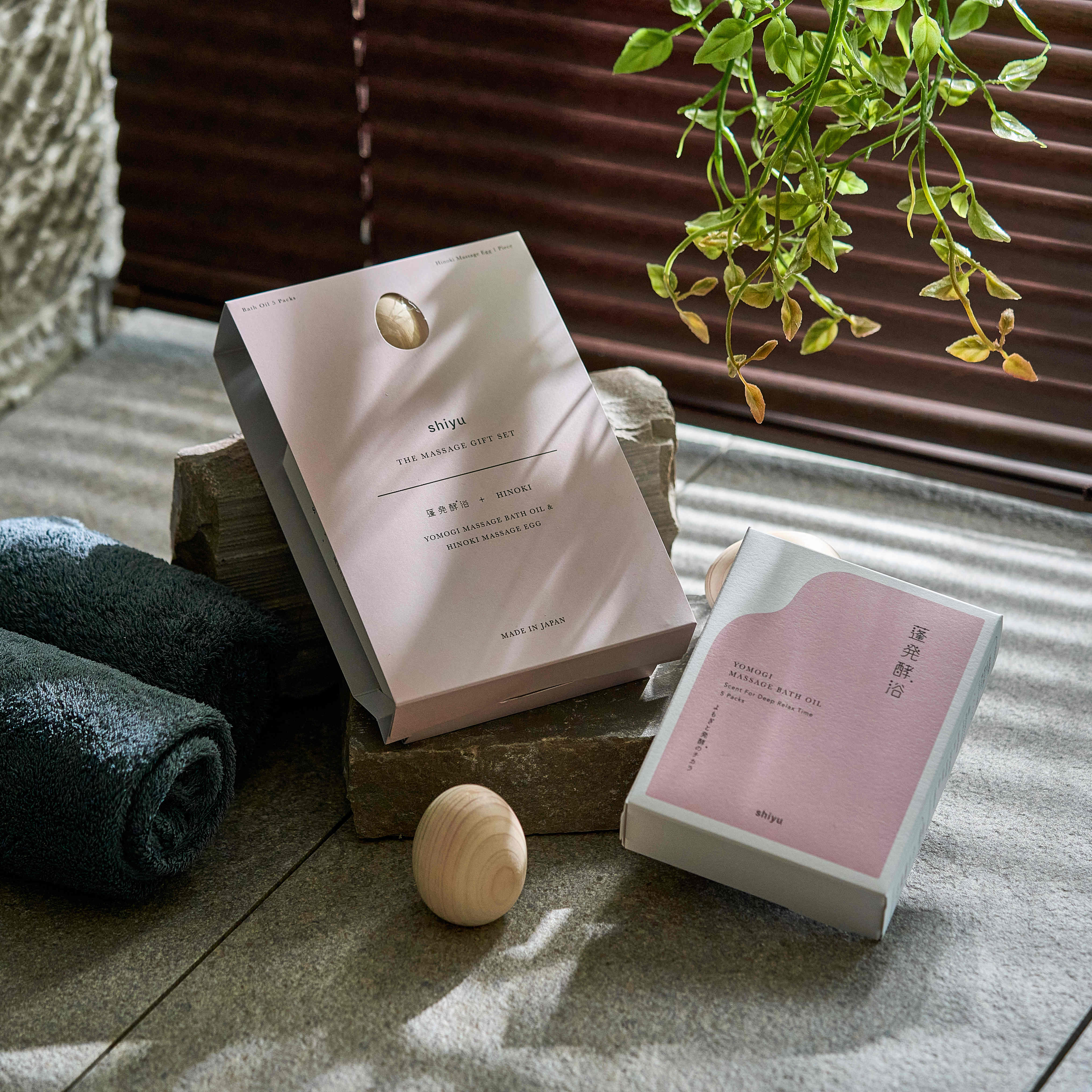 大口注文・法人のお問い合わせはこちらマッサージバスオイルとヒノキエッグのギフトセットです。 マッサージバスオイルは古来から伝わるハーブよもぎ&発酵エキス自然由来指数95%(ISO16128準拠) 濃縮※1したよもぎ※2と、温浴効果を高める発酵成分※3のチカラで、肌をしっとりやらかく整え、湯上がり後もじんわり温かさが続きます。また巡りを良くする3つの和漢植物エキス※4を配合。 香りはヒノキをベースにした天然精油オンリーの優しい香りです。 ※1 1回分(10ml)のヨモギ葉エキス(保湿成分)配合量、shiyuバスエッセンスとの比較 ※2 ヨモギ葉エキス(保湿成分) ※3(アスペルギルス/サッカロミセス)/コメ発酵エキス液(保湿成分) ※4 ウンシュウミカン果皮エキス、ツボクサエキス、ツルドクダミ根エキス(全て保湿成分)