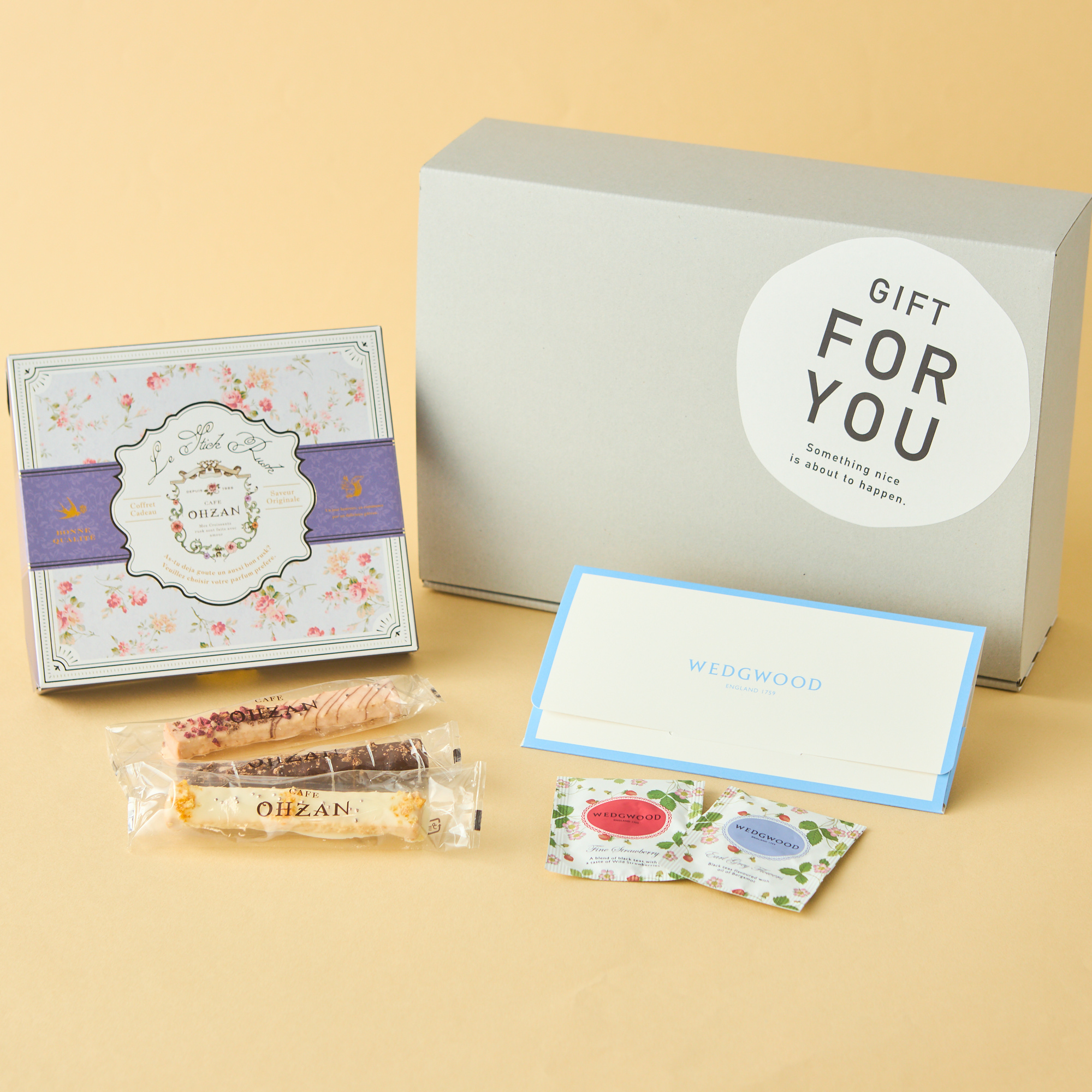 野イチゴ柄が愛らしいティーバッグと、2種類から選べる「CAFE OHZAN(カフェ オウザン)」の宝石のようなラスクのギフトセット。専用のギフトBOXに入れてお届けします。