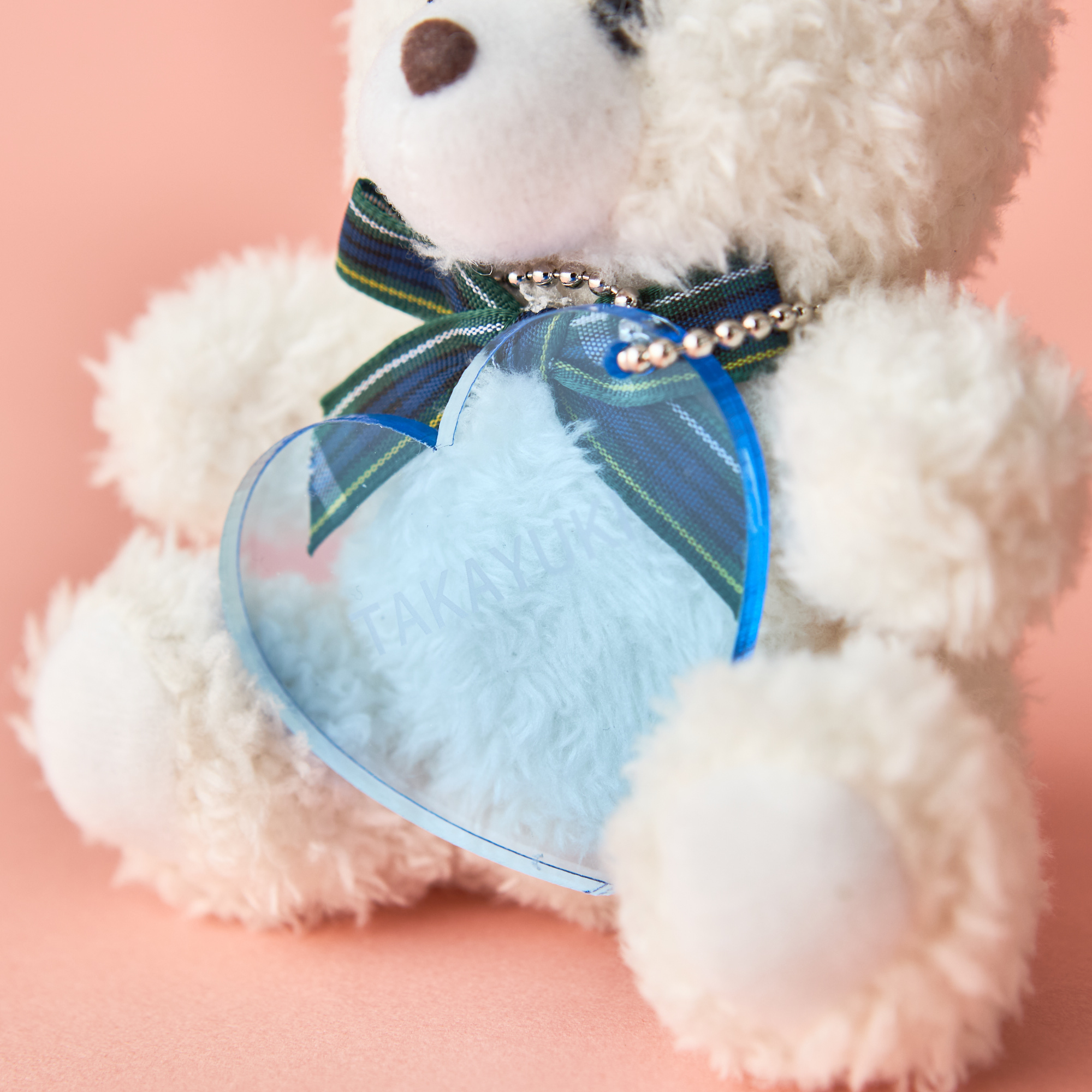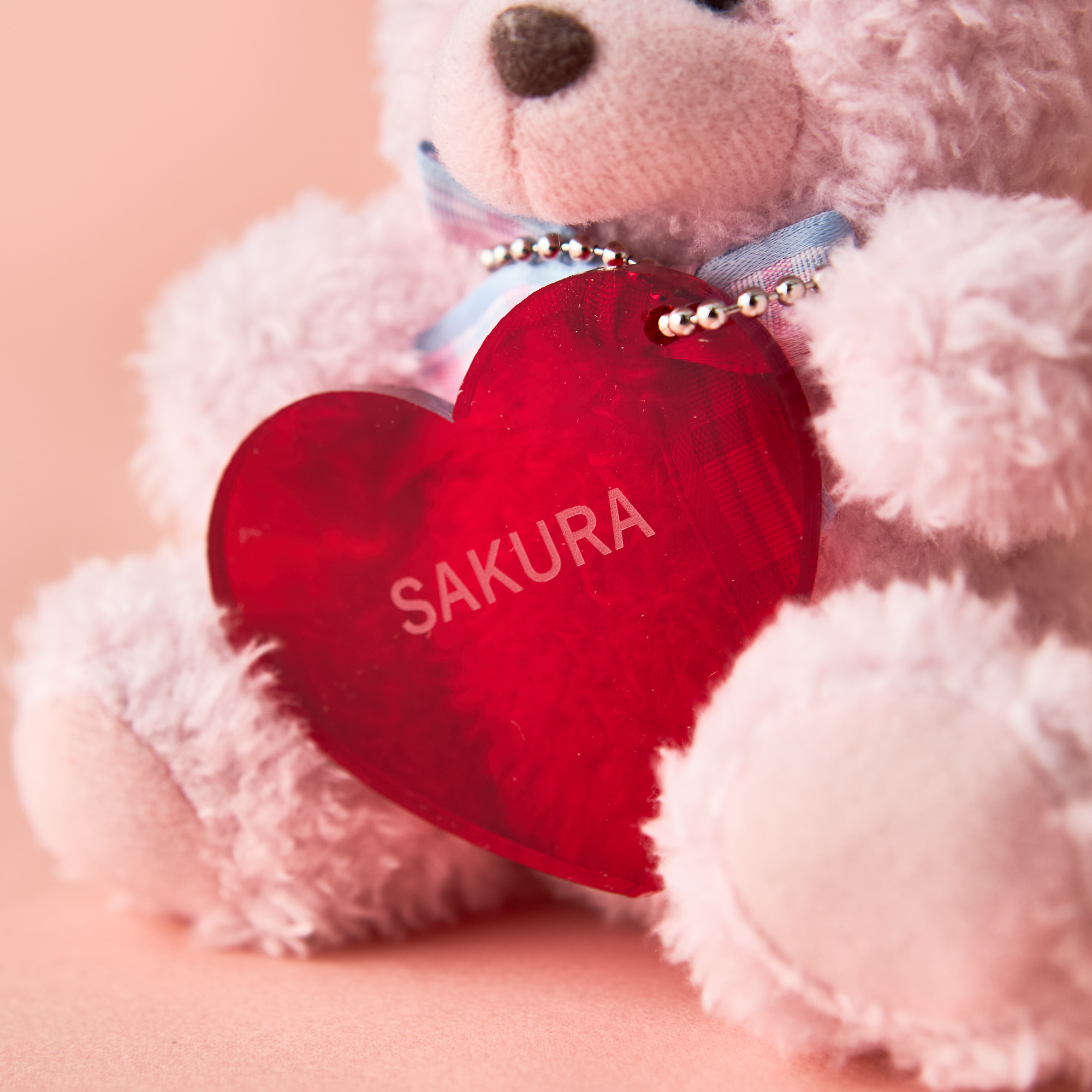 アクリルの表面と厚みのカラーが微妙に違って見えるおしゃれなハート型のチャームです。 お色はライトブルーとレッドの2色をお届け。 表面には名入れができ、ボールチェーンをマスコットの首元につけてくまに持たせることができます。 ※名入れなしをご選択の場合、輸送中の傷付き防止のため、保護シートを貼った状態で納品させていただきます。 お手数をおかけいたしますが、商品到着後、お客様ご自身で保護シートを剥がしていただきますようお願い申し上げます。