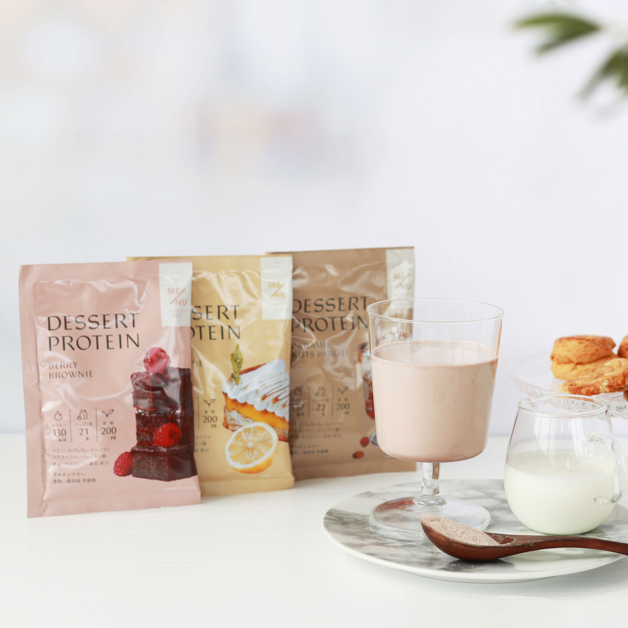 吸収スピードに差のある両者をミックスすることで、効果的かつ持続性のあるタンパク質補給を叶えます。 ホエイプロテインを飲むと、筋肉がムキムキになるのでは…と不安になる方がいらっしゃるかと思いますが、ボディビルダーのような過剰な筋肉トレーニングを行わない限り、プロテインを摂取しただけで筋肉ムキムキになることはありません。 美しく健やかな毎日のためにも「デザートプロテイン」で栄養補給しましょう。