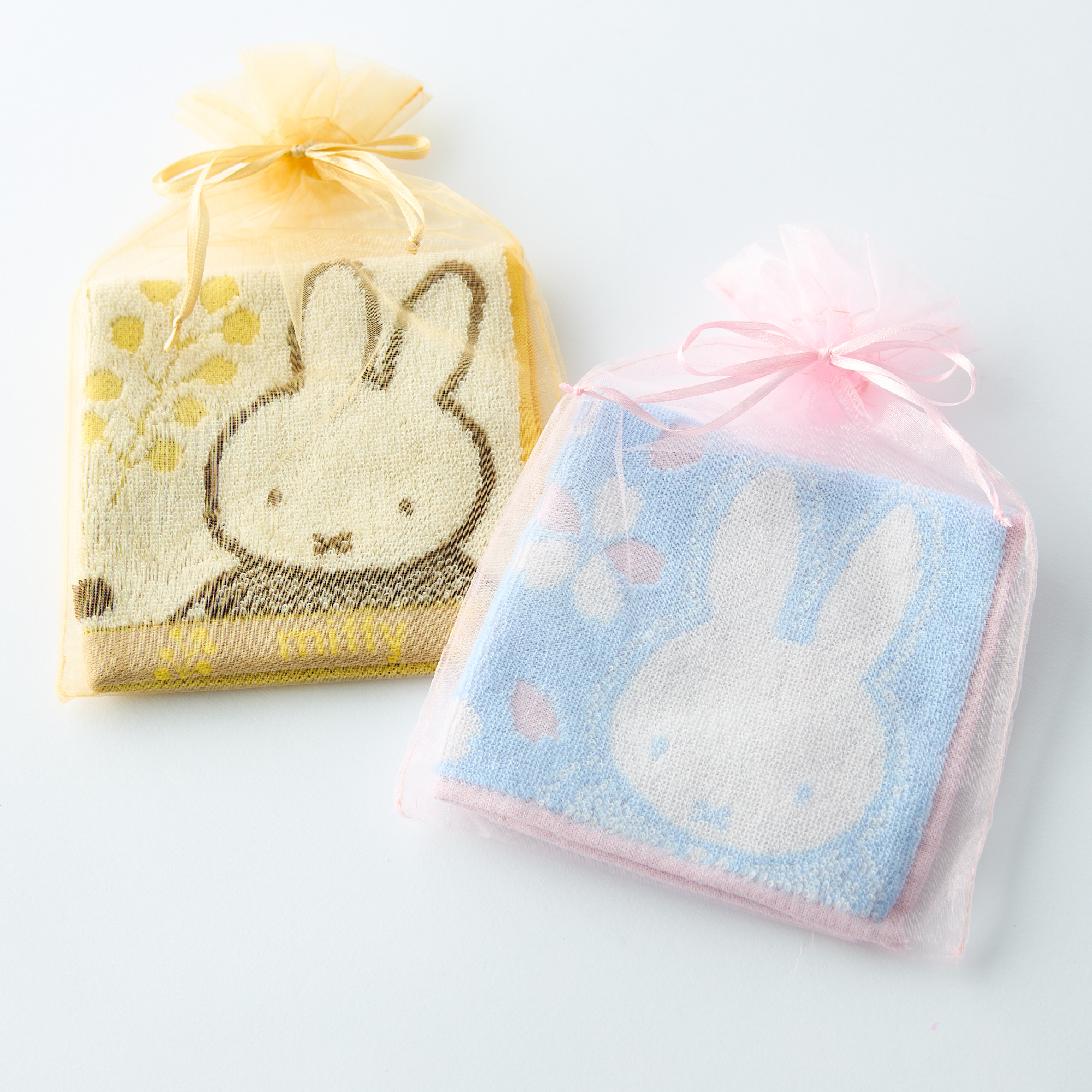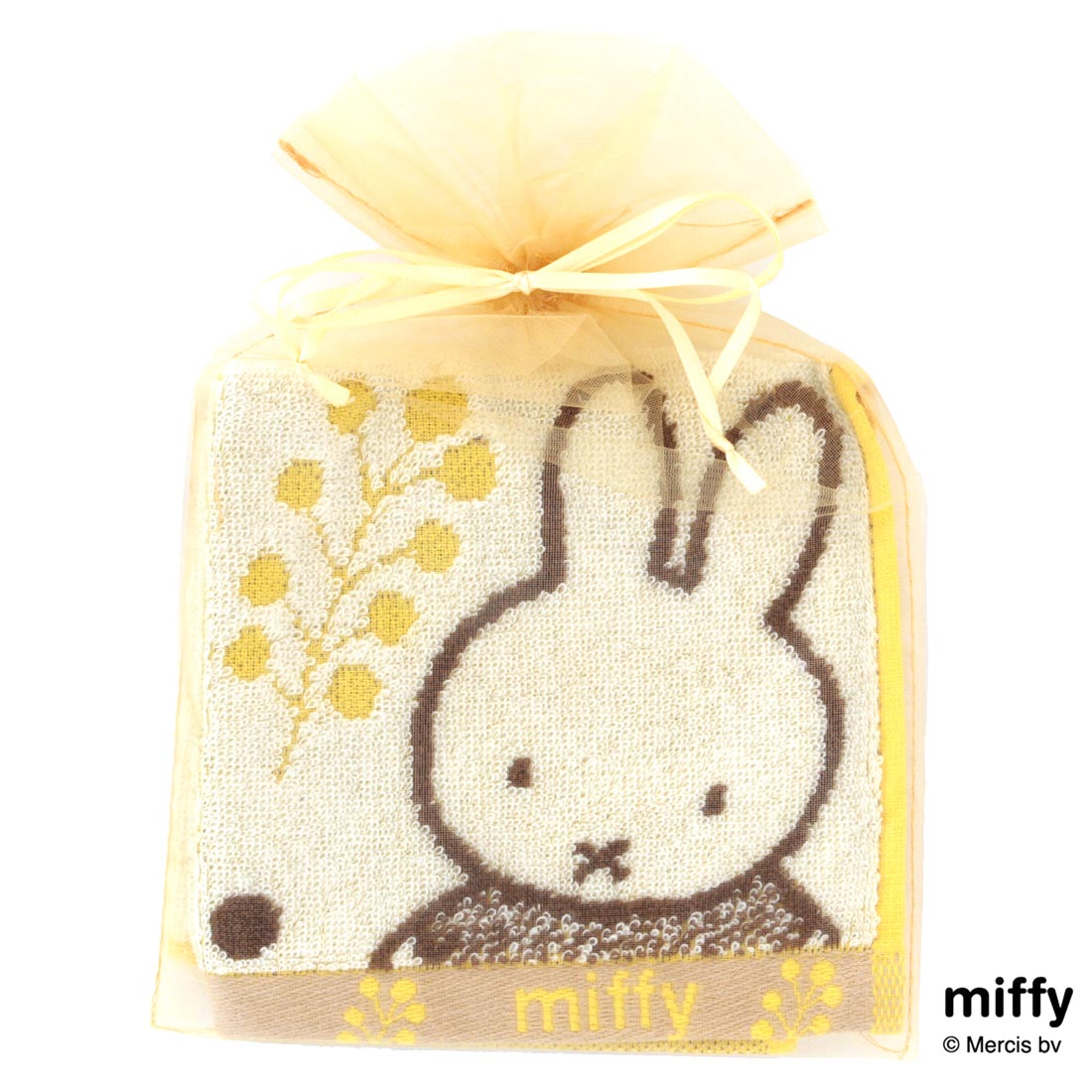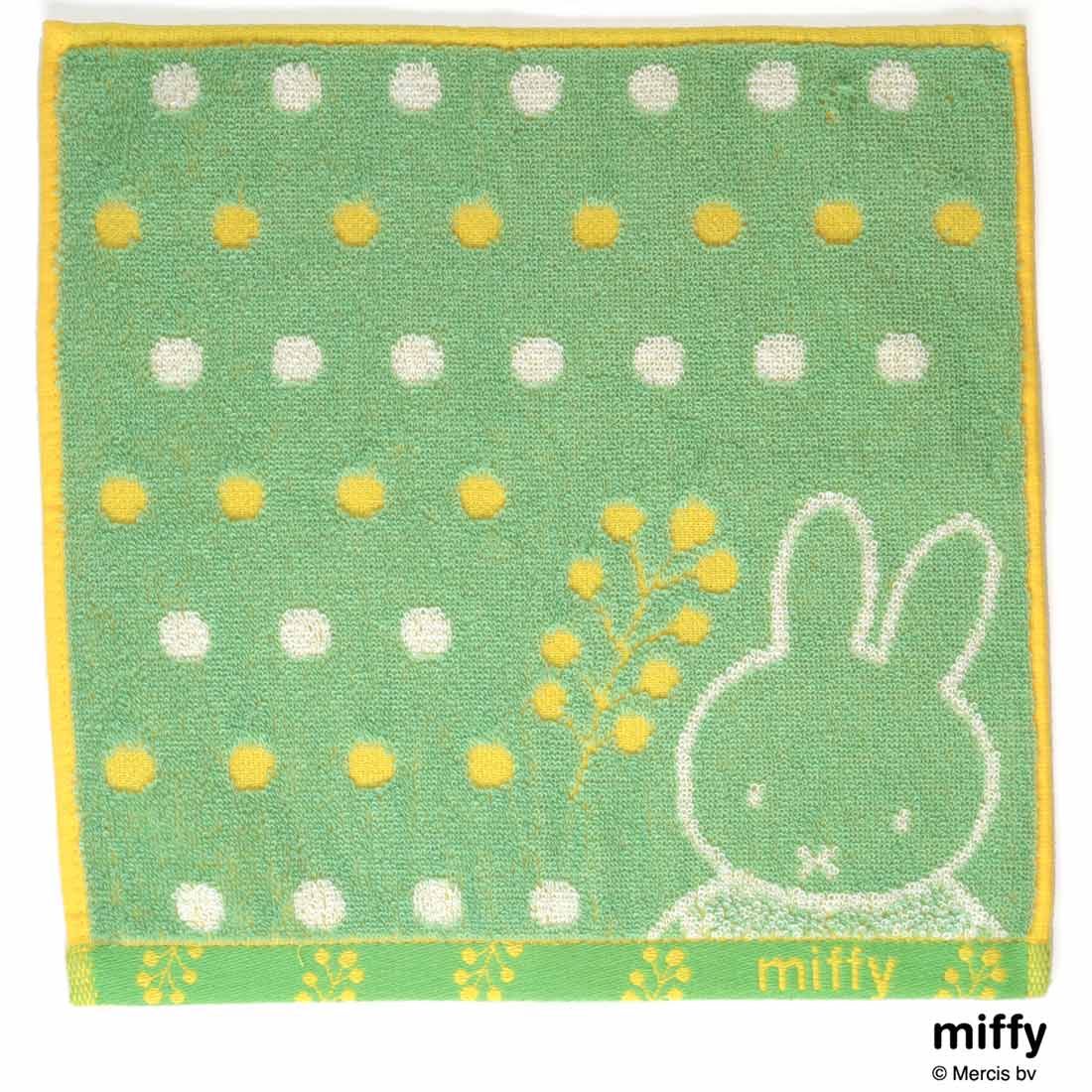 それぞれのキャラクターが持つイメージカラーをポイントにパイルジャカードで表現したタオルハンカチのシリーズ。ミッフィーと春の黄色いお花をイメージしたミニタオルです。