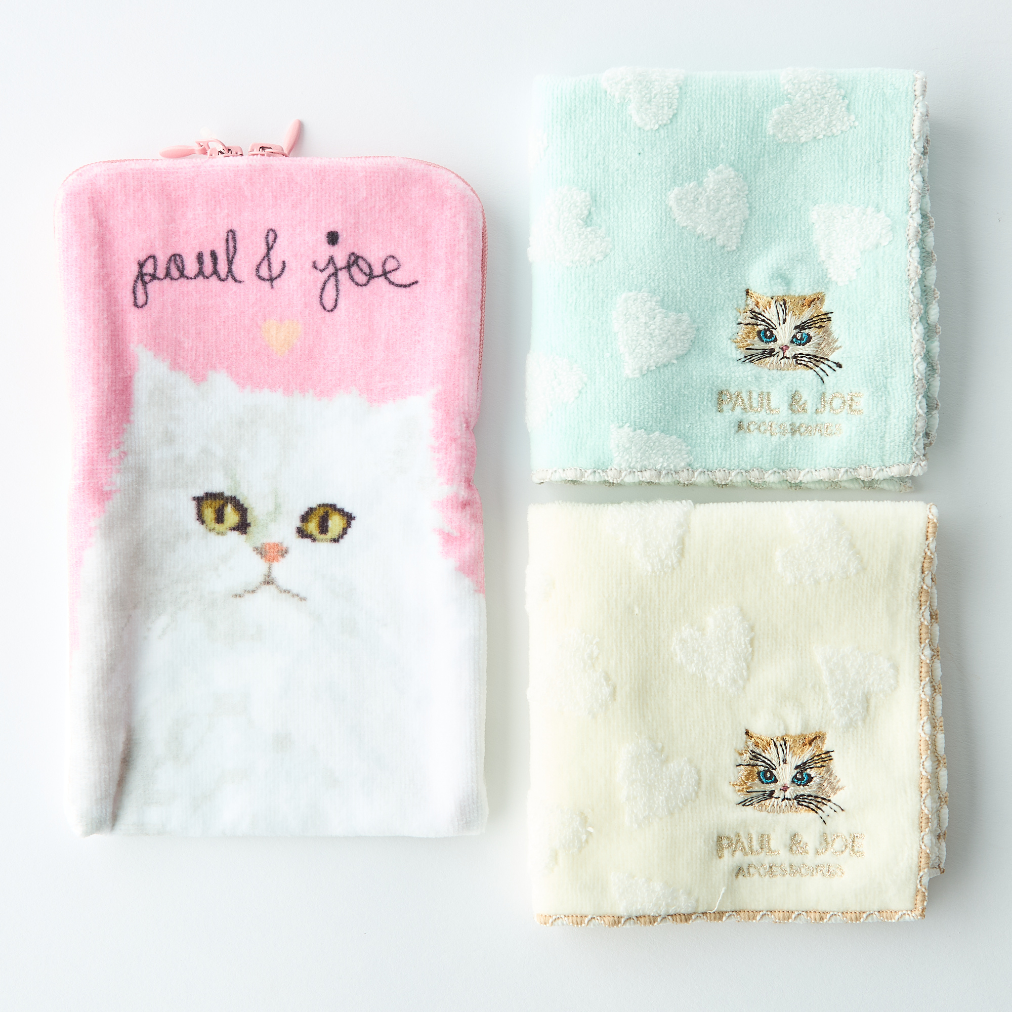 「PAUL&JOE(ポール&ジョー)」の選べるタオルポーチ&タオルハンカチセット。タオルハンカチは猫の「ジプシー」とブランドのアイコンである「クリザンテーム」の2種類の柄からお選びいただけます。