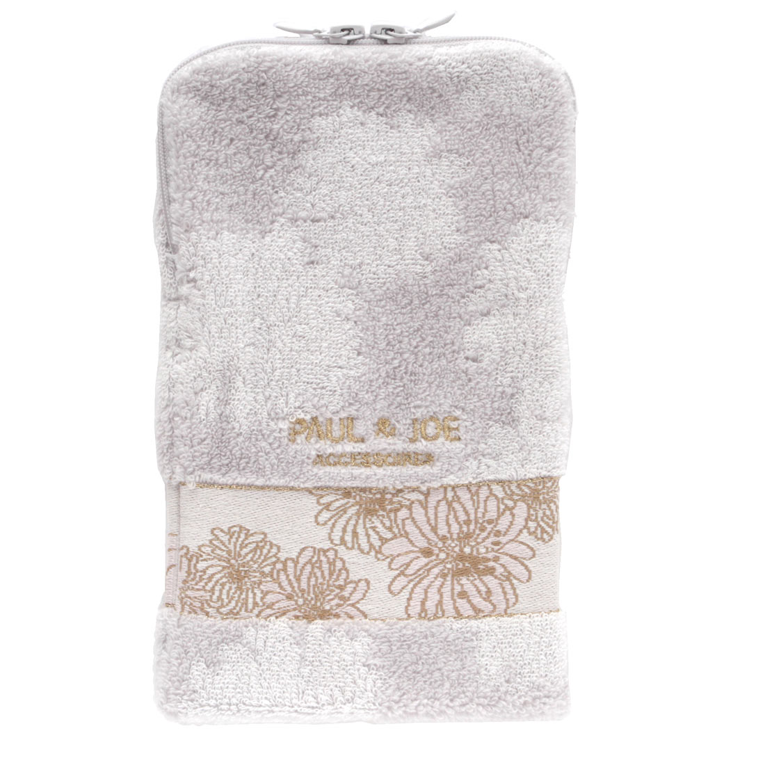 PAUL&JOE ACCESSOIREの定番柄である、花柄のクリザンテーム・猫のジプシーとヌネットを集めた定番コレクションです。 クリザンテームを織りで表現した大人なファスナー付きタオルです。 500mlペットボトルが入るサイズ感。タオル素材で手触りが良く、丸洗い出来ます。使用後畳んで小さくなるのも便利です