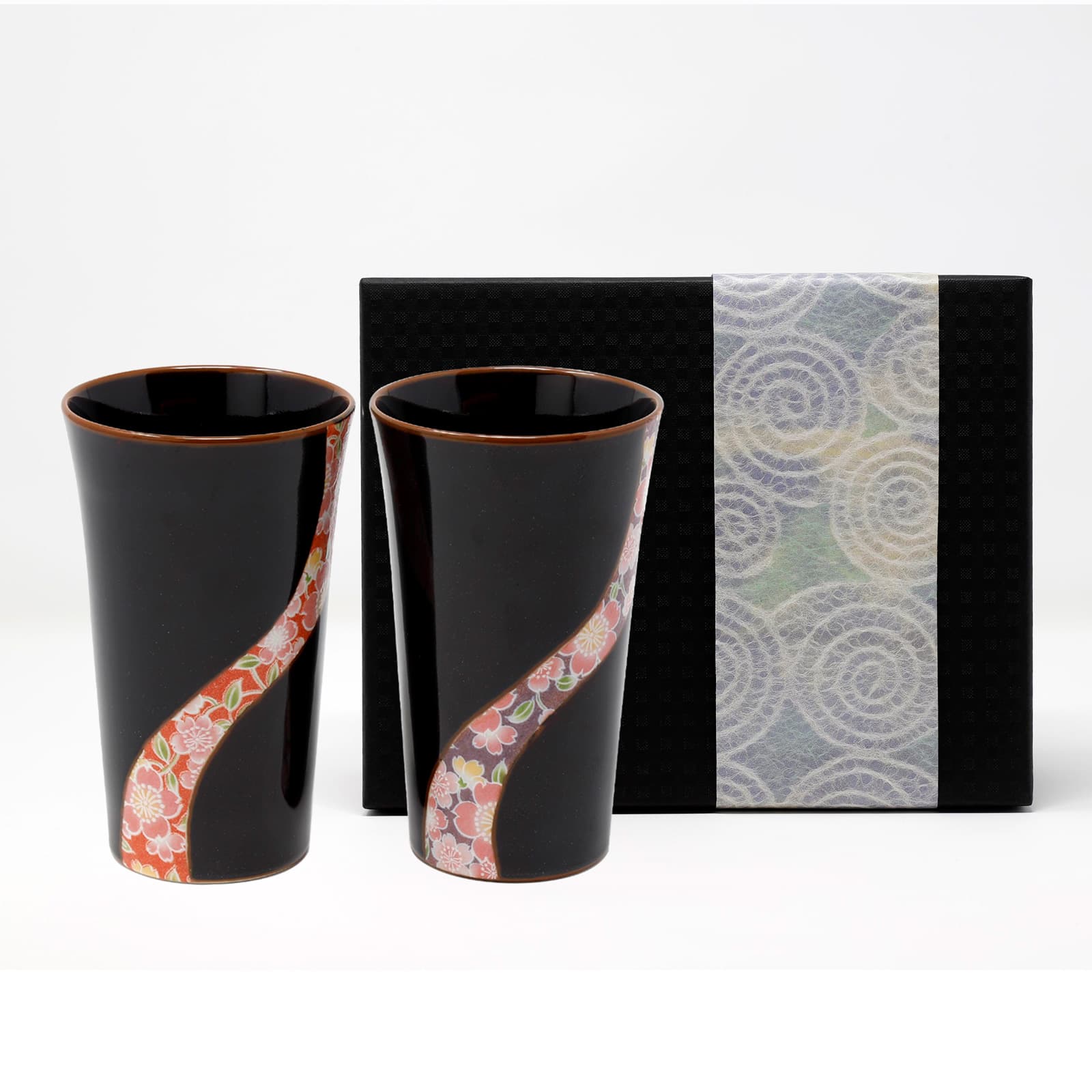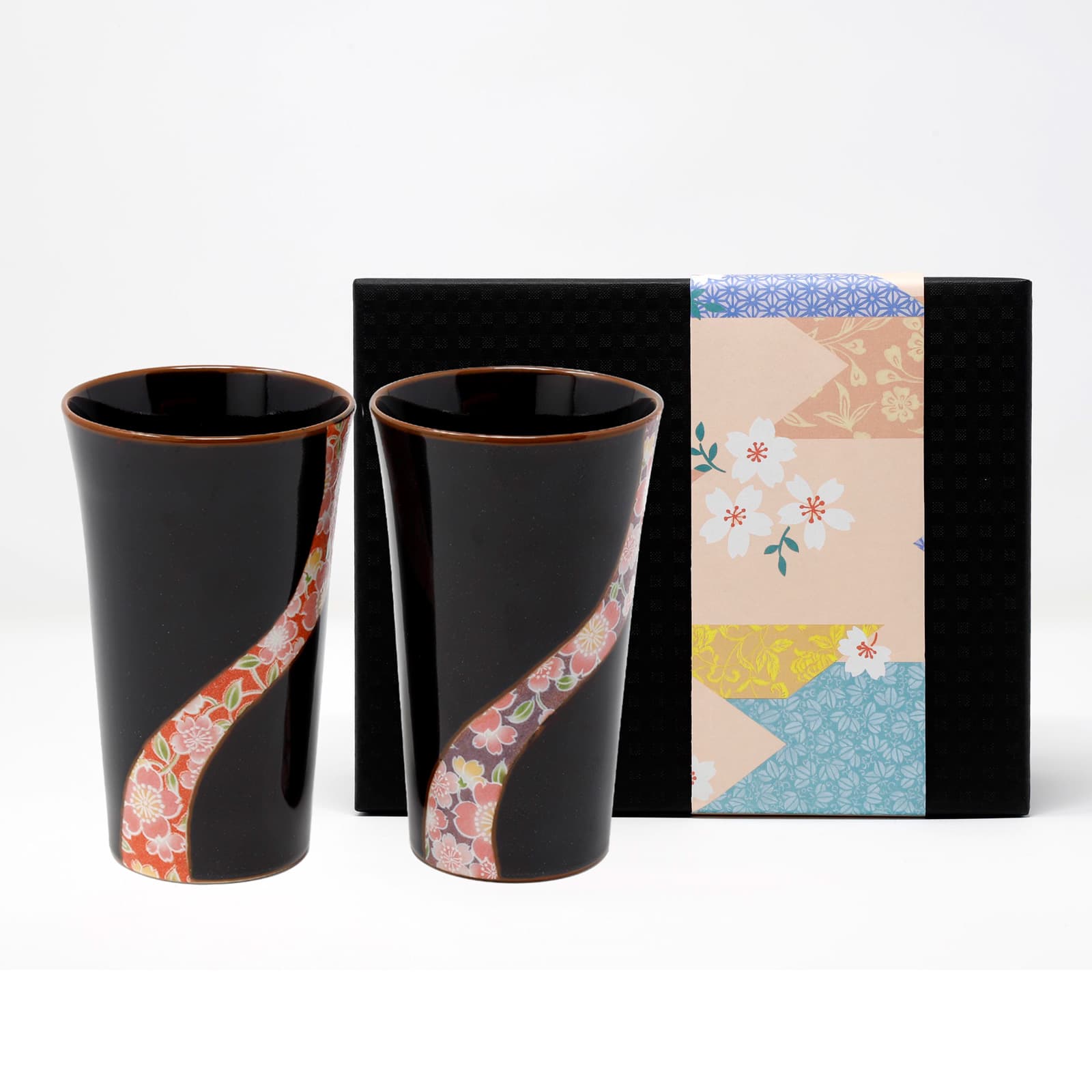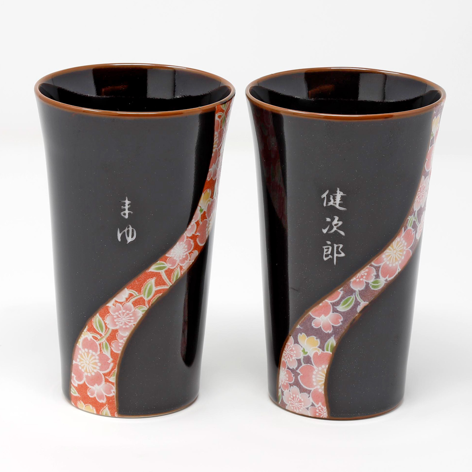 深い黒に京友禅の桜模様をイメージしたデザインの有田焼ペアカップ。