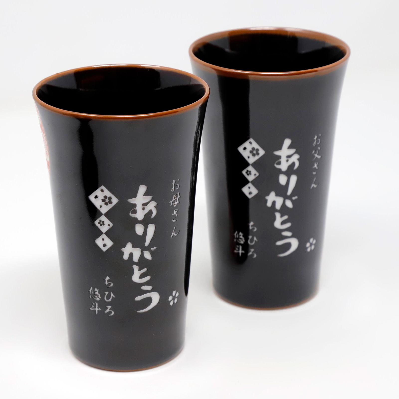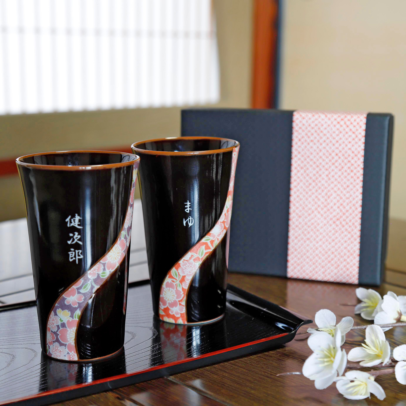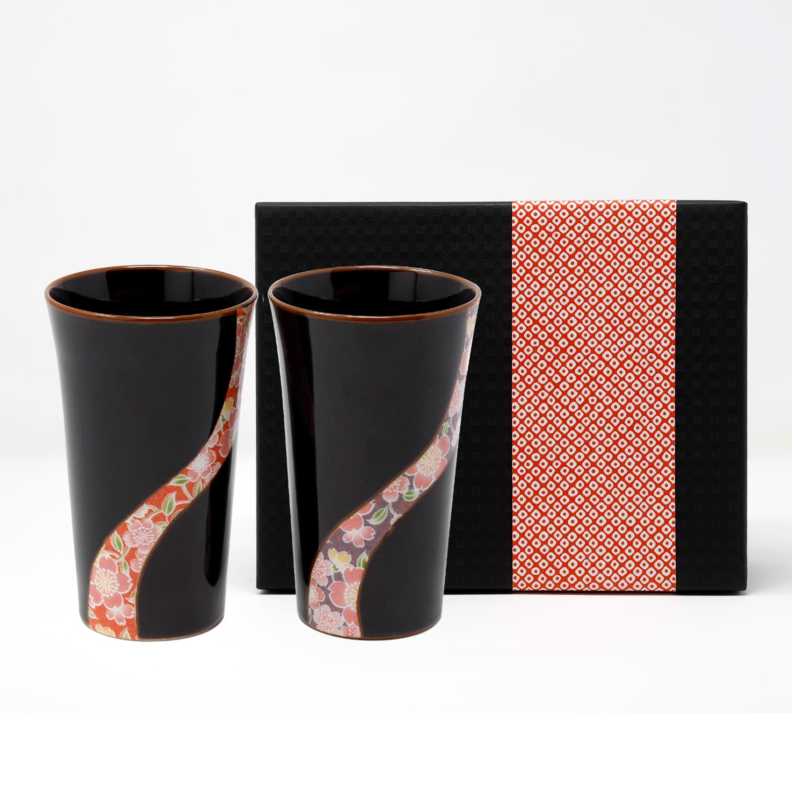 深い黒に京友禅の桜模様をイメージしたデザインの有田焼ペアカップ。