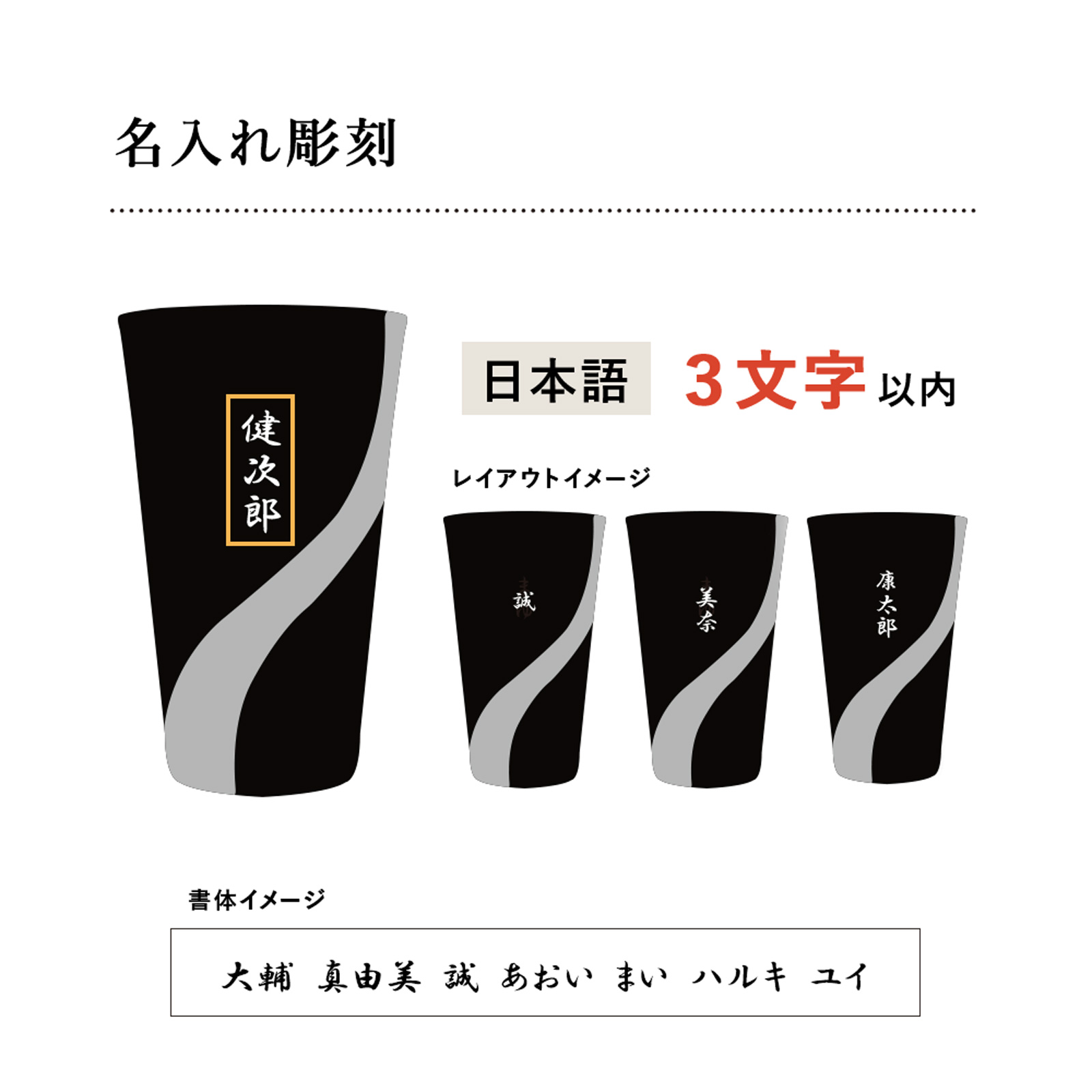 3文字までのお名前を彫刻いたします。 アルファベットには対応しておりません。