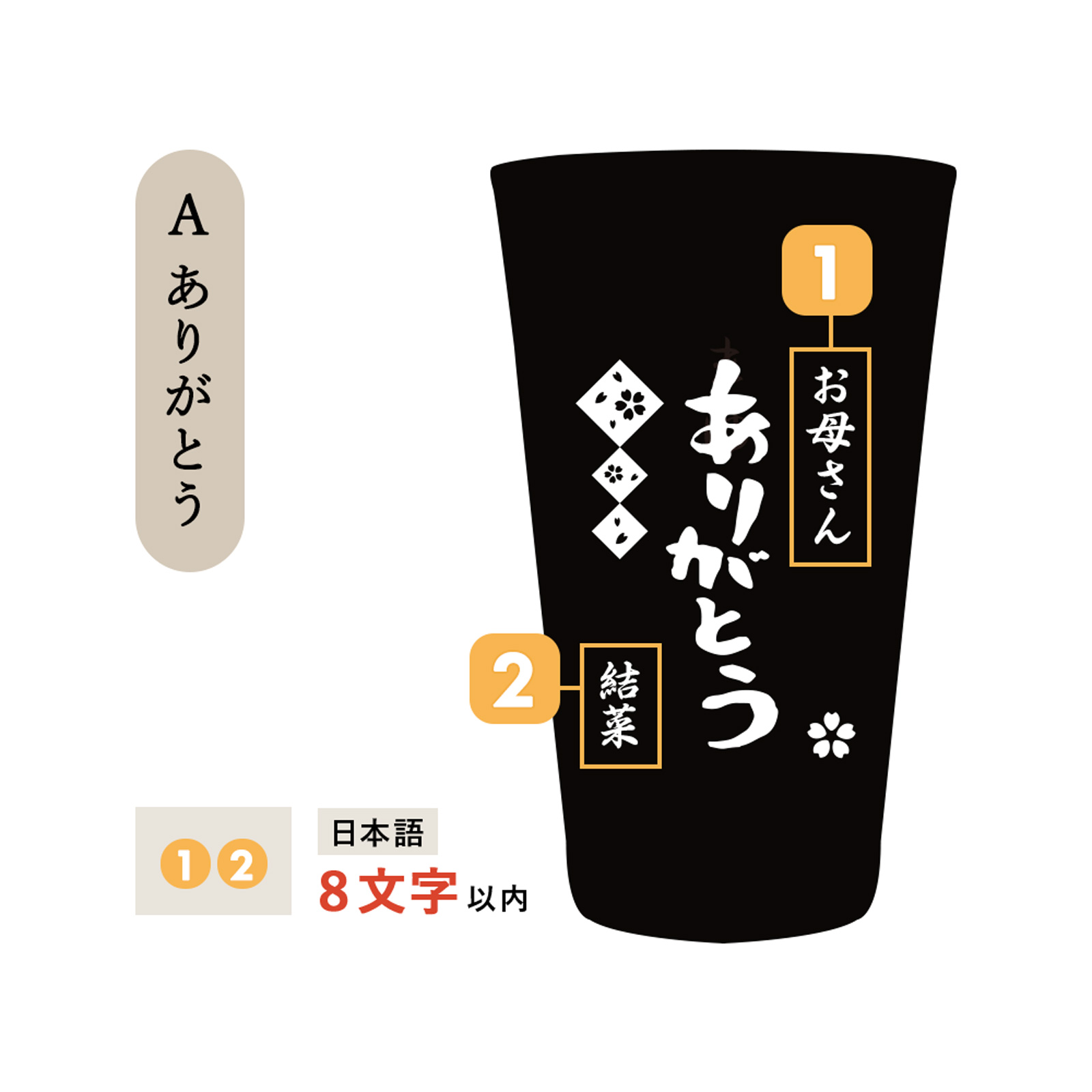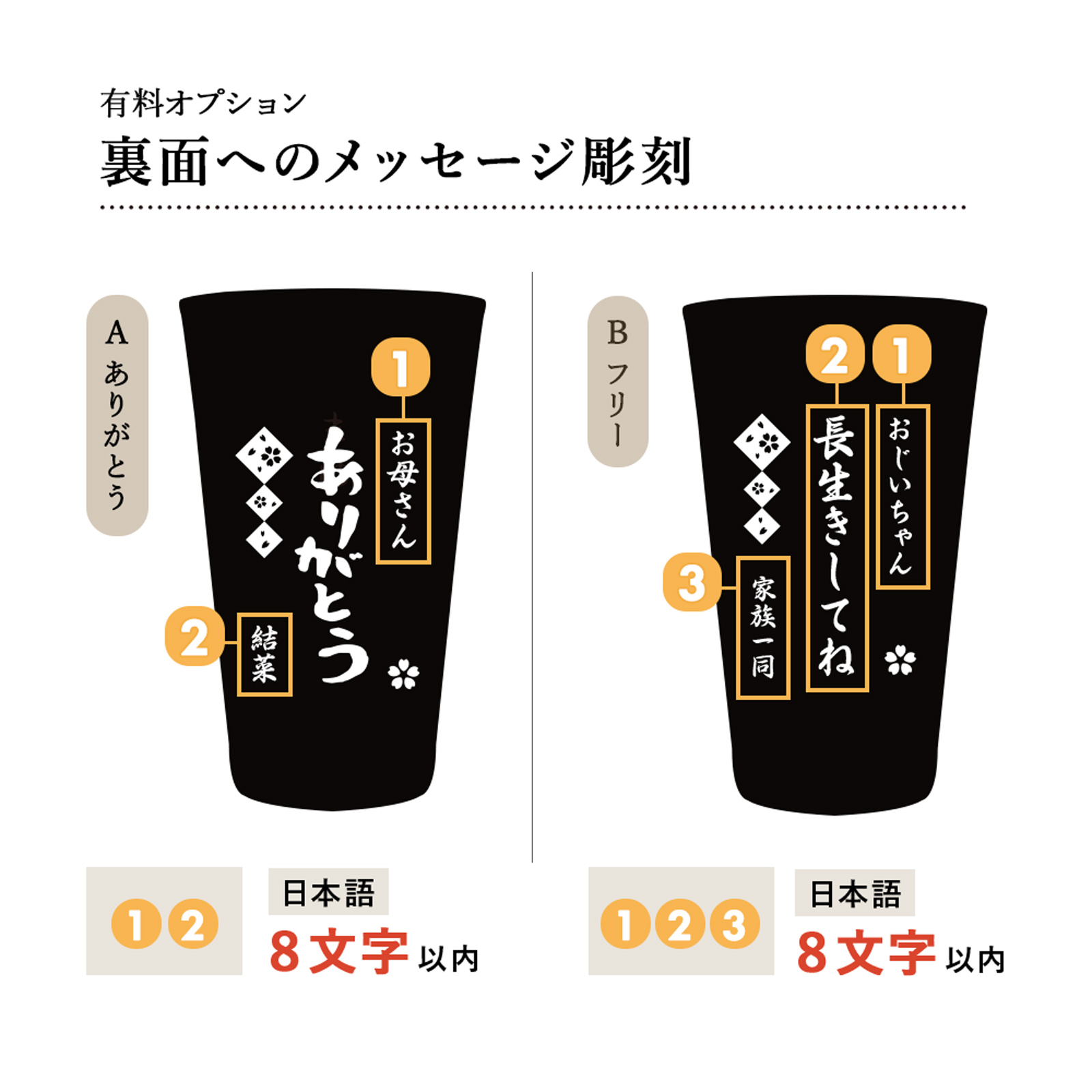 オプションで裏面(名入れ彫刻面の反対側)にメッセージを彫刻する事が可能です。 「ありがとう」とフリーメッセージの2パターンからお選びいただけます。 アルファベットには対応しておりません。 ※有料オプションです