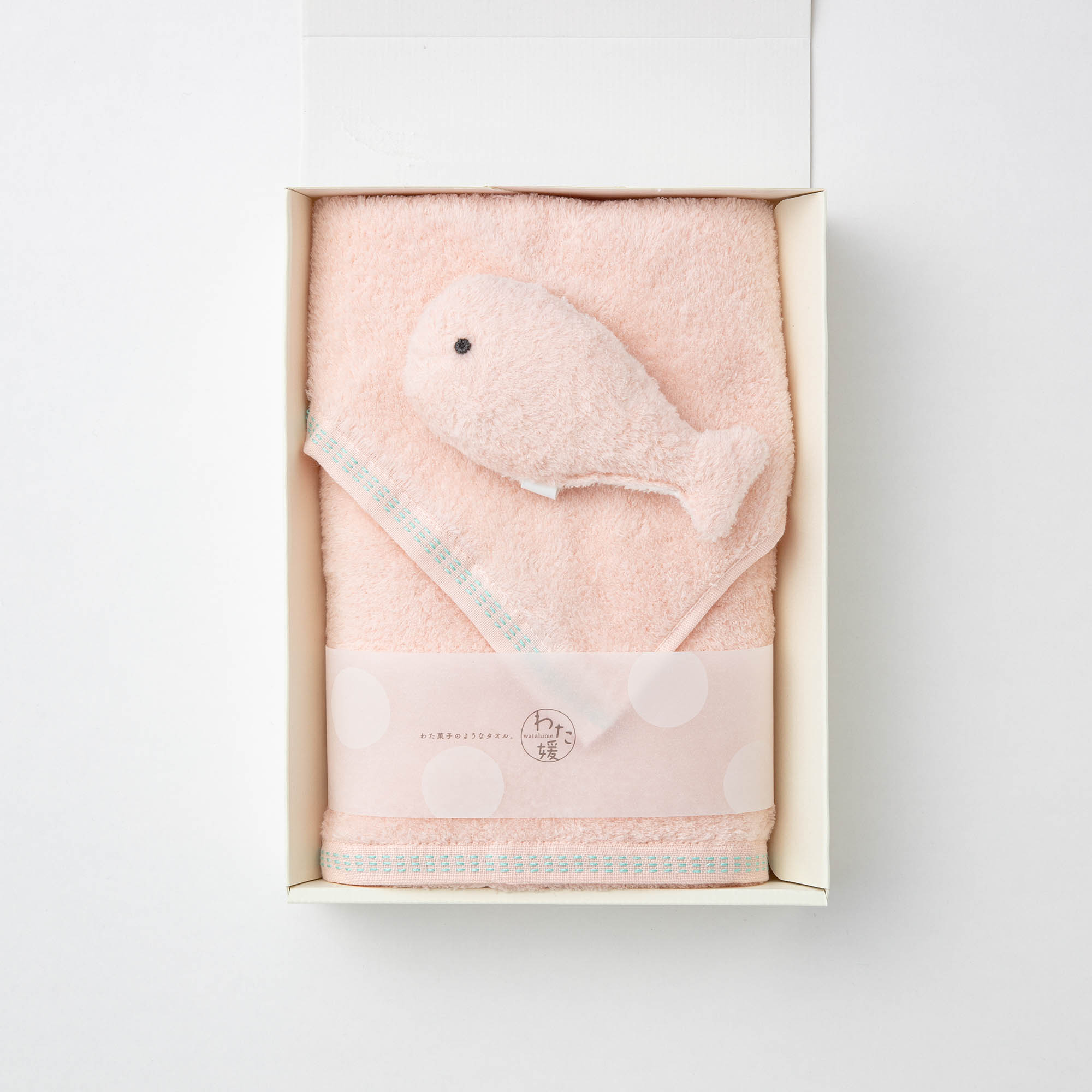 まるでお菓子のようにふわふわな生地で赤ちゃんのお肌に優しく触れます。フェイスタオル、ハンドタオル、おもちゃのセットでプレゼントにぴったりです。