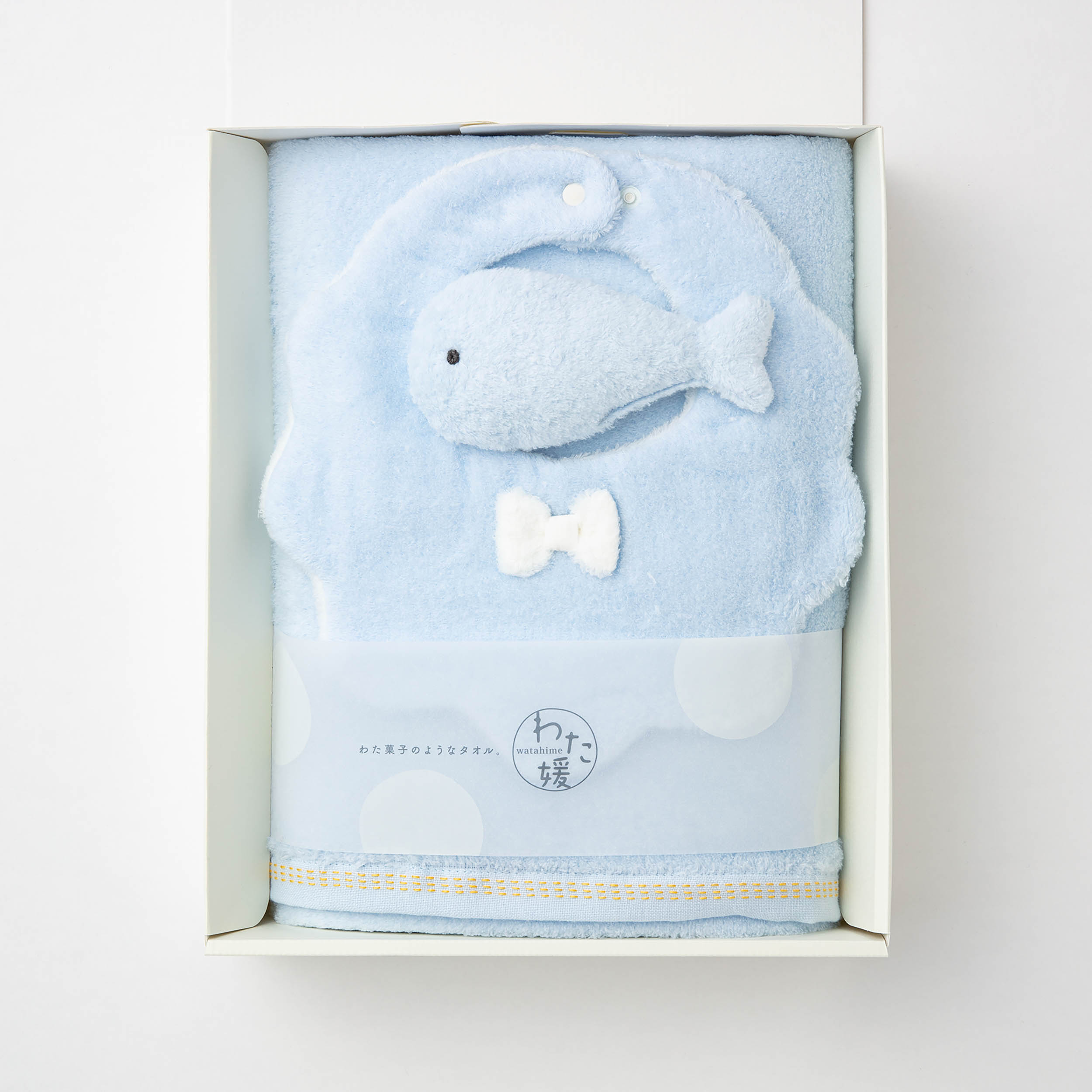まるでお菓子のようにふわふわな生地で赤ちゃんのお肌に優しく触れます。バスタオル、スタイ、おもちゃのセットでプレゼントにぴったりです。