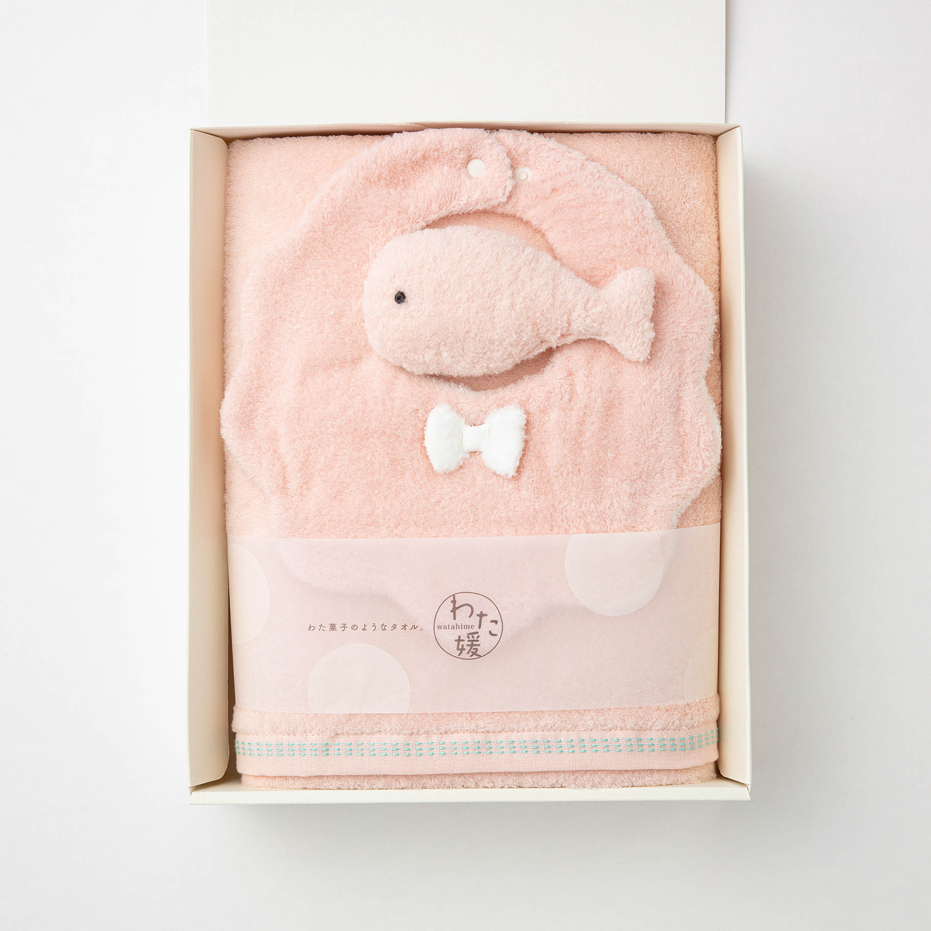 まるでお菓子のようにふわふわな生地で赤ちゃんのお肌に優しく触れます。バスタオル、スタイ、おもちゃのセットでプレゼントにぴったりです。