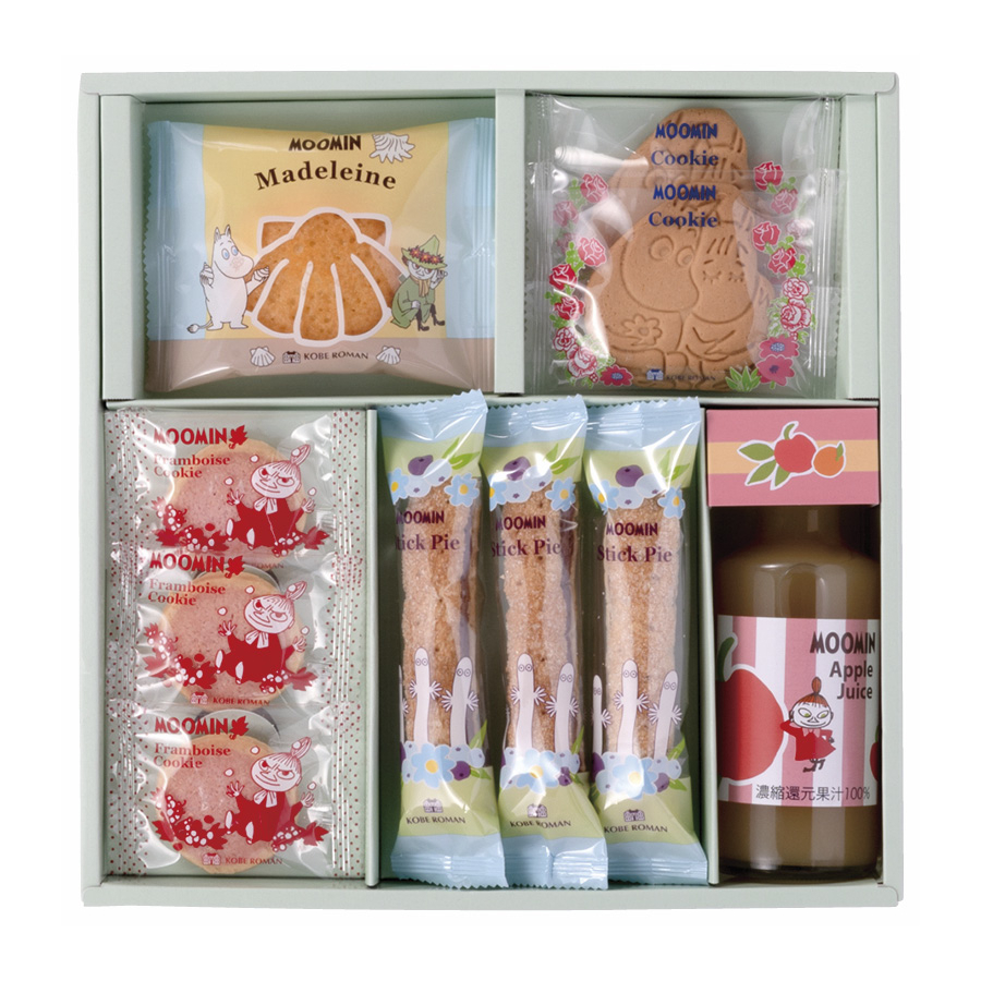 大口注文・法人のお問い合わせはこちら世界中で愛され続けるムーミン。人気キャラクターたちが作るムーミンの世界を、詰め合わせたスイーツギフトセットと一緒にお届けします。 【セット内容】 ブルーベリースティックパイ・フランボワーズクッキー×各3、バニラ型押しクッキー×2、バニラマドレーヌ・アップルジュース(180ml)×各1