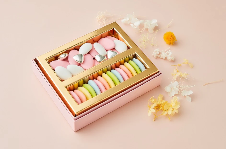 パッケージカラーも白をベースにキュートなパステル系カラーなど豊富な品揃えが魅力。パッケージの小窓からのぞく5色のドラジェ(横詰め)が目を引くデザインに。 上質なフランス産ドラジェに合わせてパッケージにも金や銀の箔で刻印を施し、蓋の内側にもドラジェのストーリーを刻印するなど、食べた後もそばに置いておきたくなるくらい手の込んだつくりになっています。