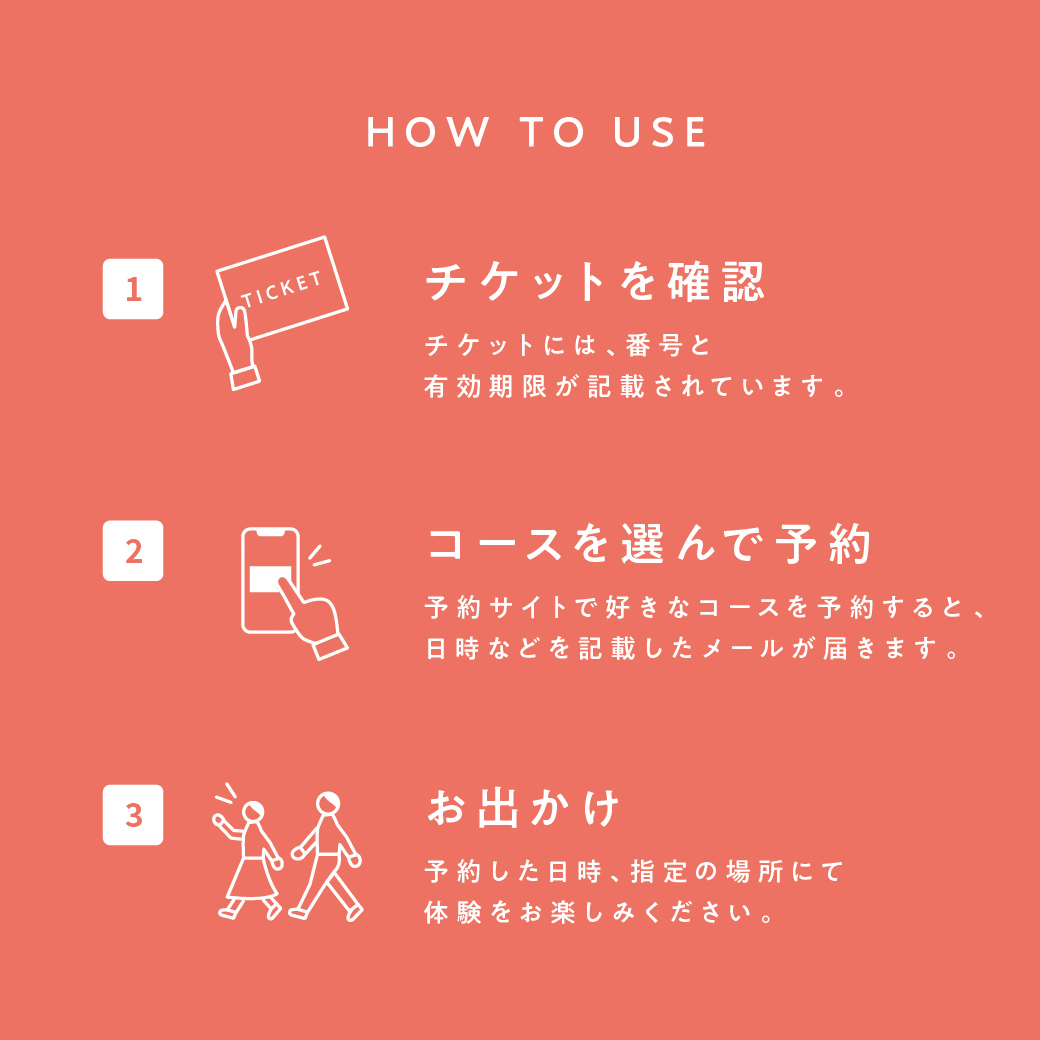 | 注意事項 | ・チケットの有効期間は6カ月間です。 ・体験の予約、申込はウェブサイトを使用します。 ・予約期限があります。チケットの有効期限の2週間前までに予約していただくよう贈り先様にお伝えください。期限の延長はできませんのでご注意ください。 ・ご利用できる体験の種類や施設、コース内容、エリア等は、予告なく変更になる場合があります。最新情報は、予約サイトでご確認いただけます。 ・体験場所までの往復交通費など諸経費はお客様のご負担となります。 |