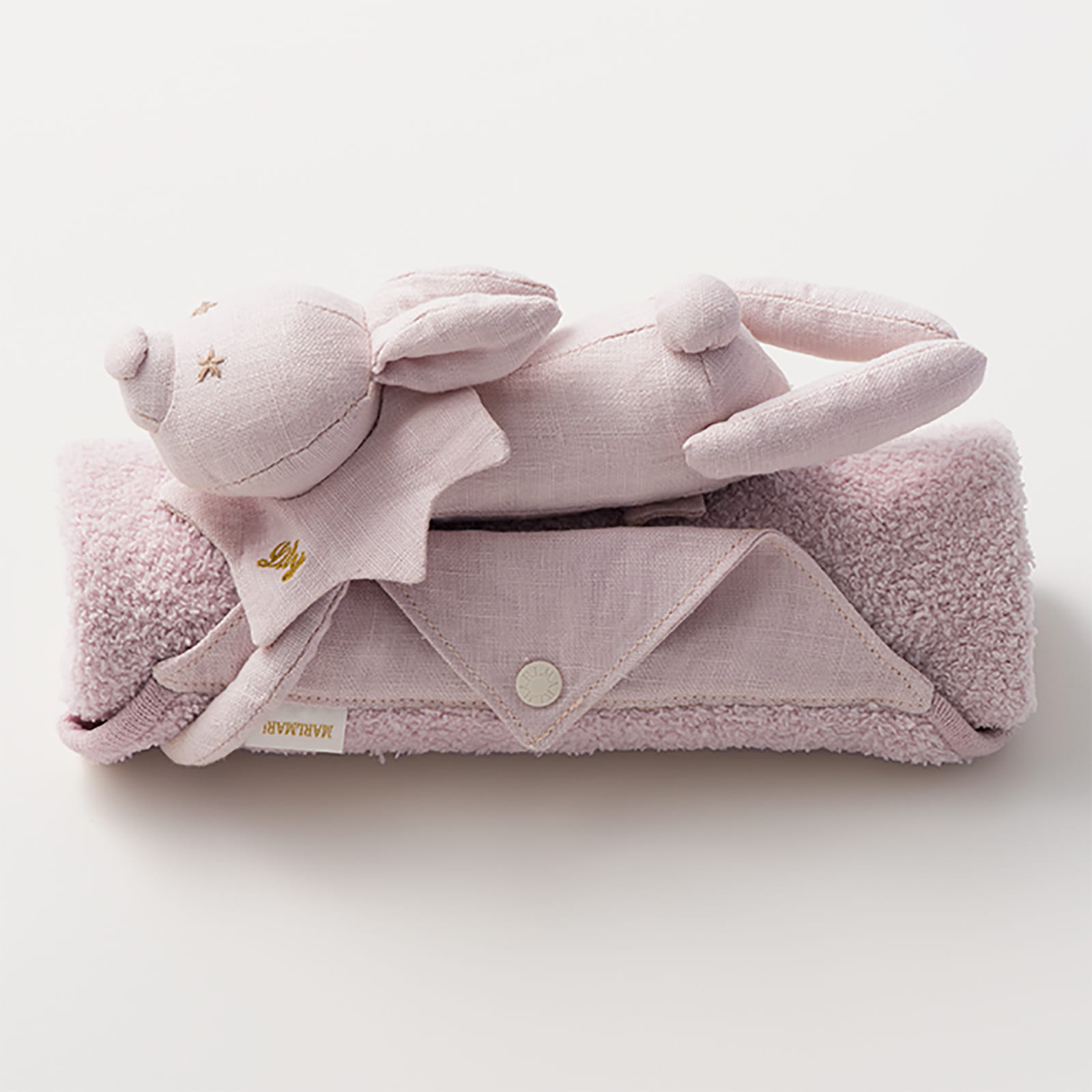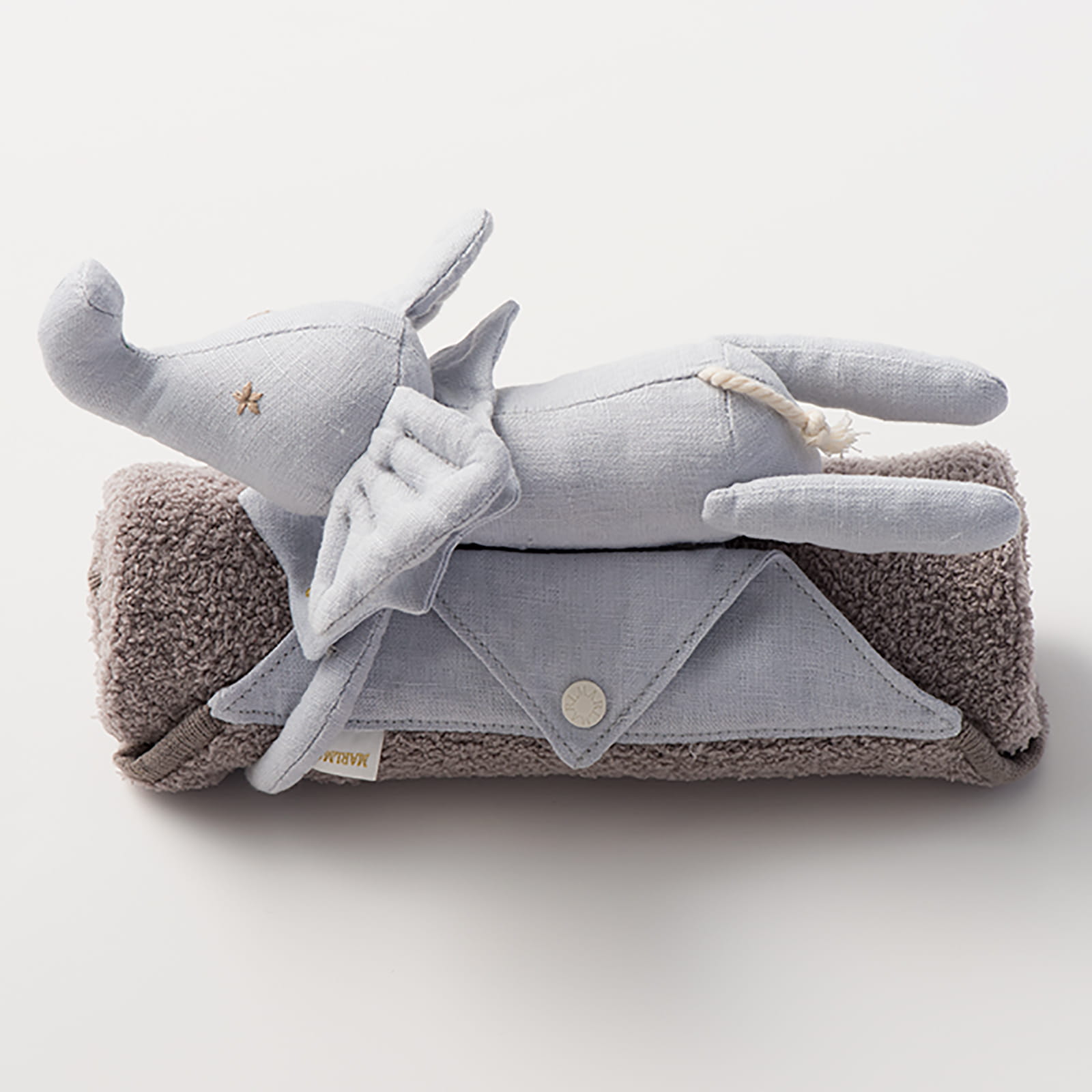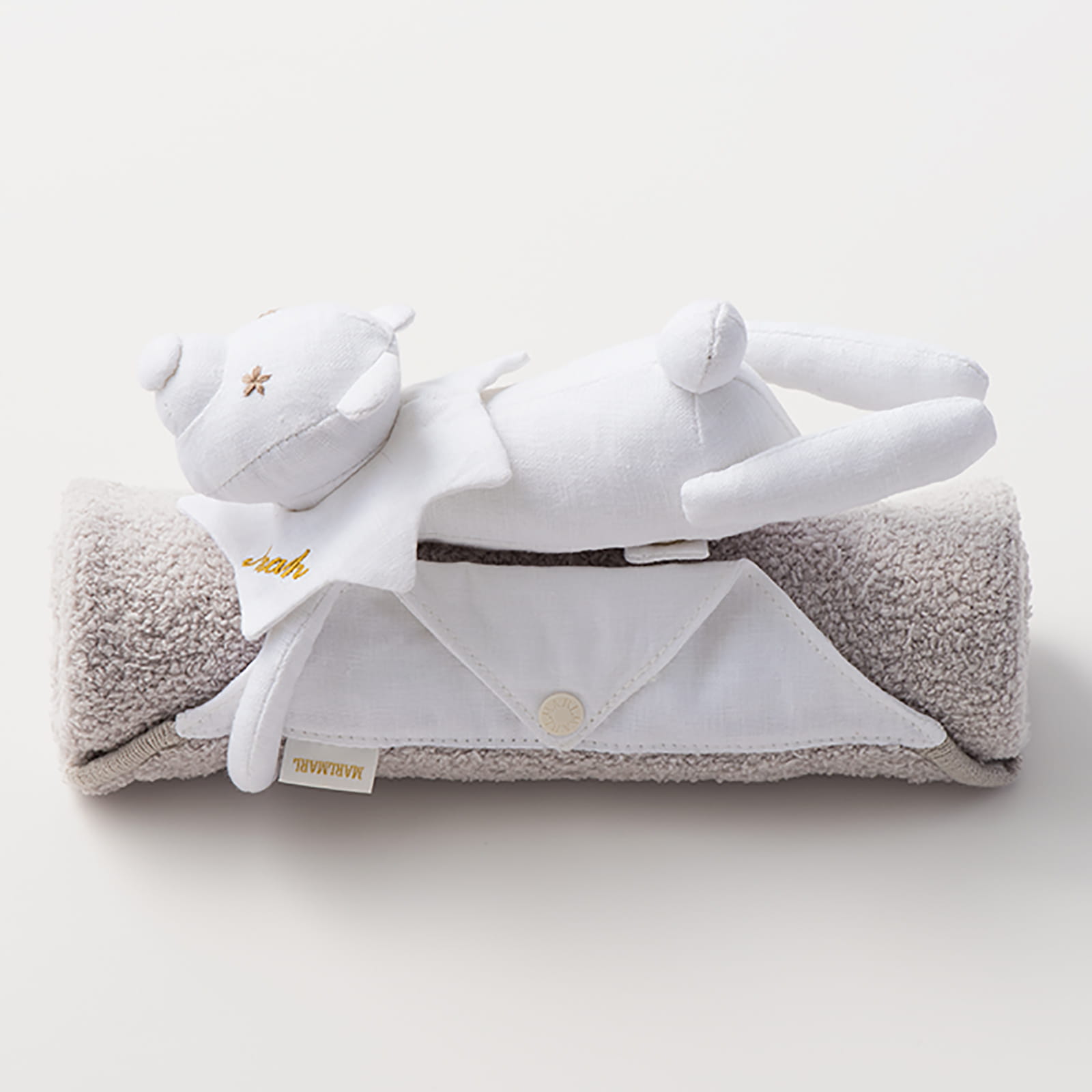 贈り物に込められたたいせつな人への思いと、ギフトを選ぶワクワクの気持ちに寄り添う「MARLMARL(マールマール)」の愛らしいぬいぐるみ付きの小さめブランケット。ぬいぐるみは、ドットボタンで取り外しが可能です。