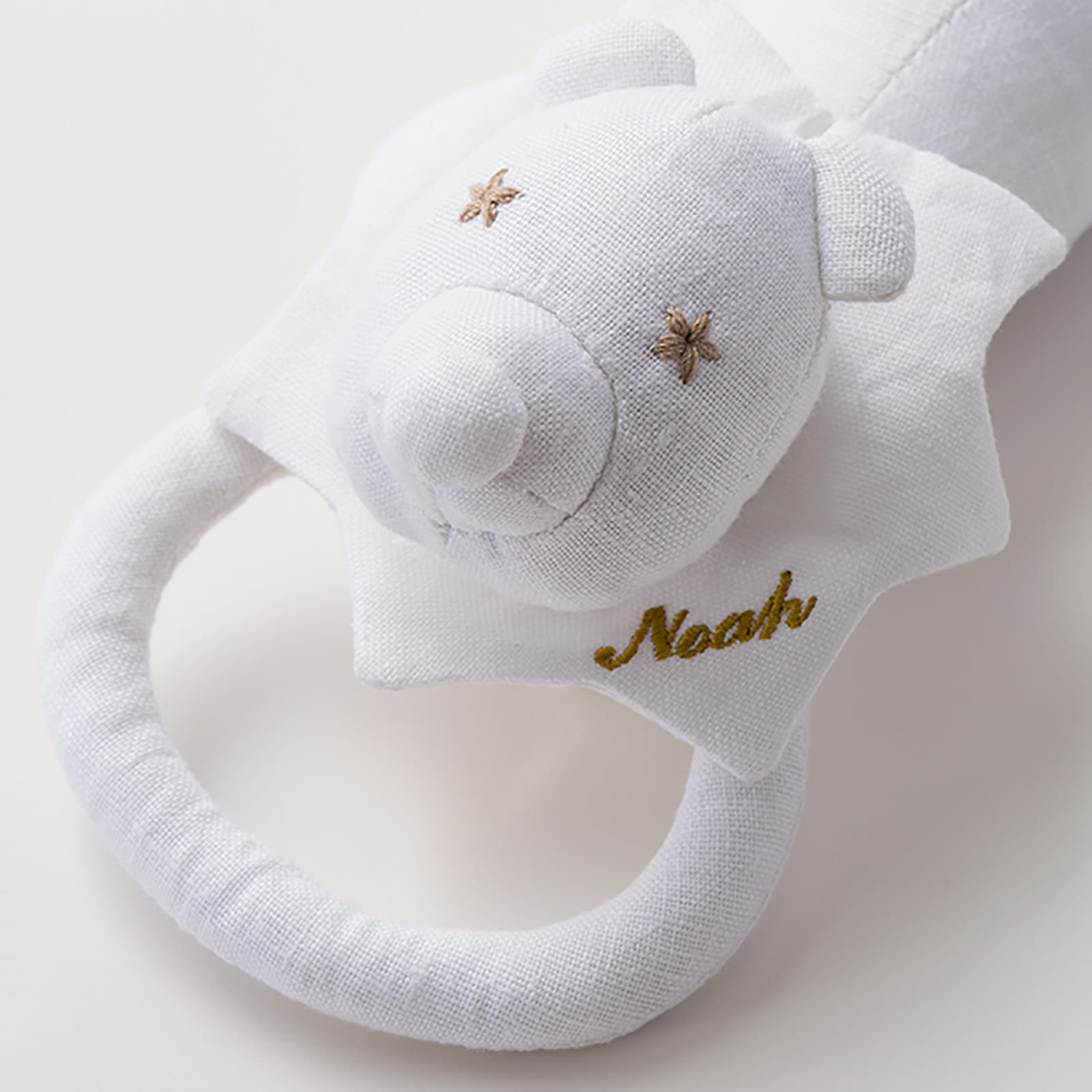 親しみを持って接してもらえるよう、ぬいぐるみの名前刺しゅうを付けました。赤ちゃんとおそろいにすれば、愛着がさらに増しそうです。