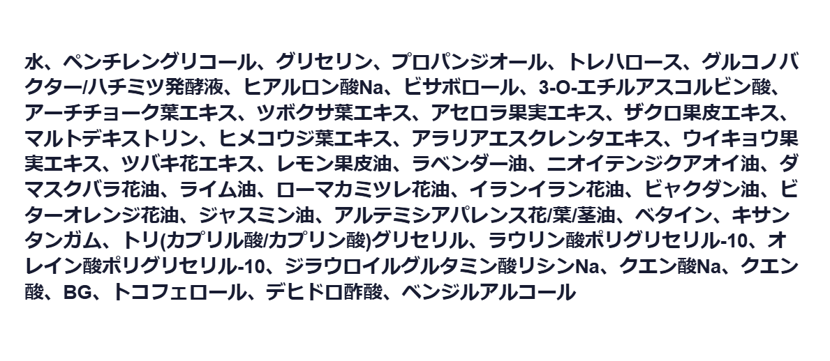 【ブライトニング】 うるおいを与え、肌のキメを整えて透き通るような透明感のある肌へ。 ビサボロール、ビタミンC誘導体(3-O-エチルアスコルビン酸)、アーチチョーク葉エキス、アセロラ果実エキス 【うるおい】 うるおいを保ち各層を整えて乾燥や外部刺激から肌を守るバリア機能をサポート。 ヒアルロン酸Na、アラリアエスクレンタエキス、ツバキ花エキス、フェンネルエキス(ウイキョウ果実エキス) 【角質・毛穴ケア】 毛穴をふさいで目立たせる原因となる古い角質や過剰な皮脂をやわらげて肌を引き締めて毛穴の目立たない肌へ。 発酵ローズハチミツ(グルコノバクター/ハチミツ発酵液)、ザクロ果皮エキス、アーチチョーク葉エキス、ヒメコウジ葉エキス