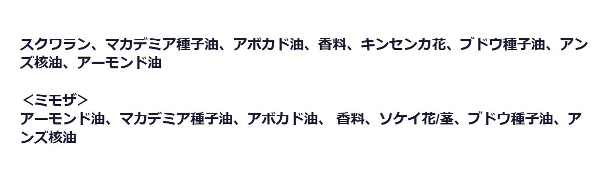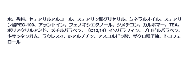 合成着色料フリー、石油系界面活性剤フリー、紫外線吸収剤フリー、シリコンフリー、パラベンフリー、合成ポリマーフリー、鉱物油フリー、合成香料フリー、アルコールフリー、動物由来成分フリー* *ハチミツ由来成分使用