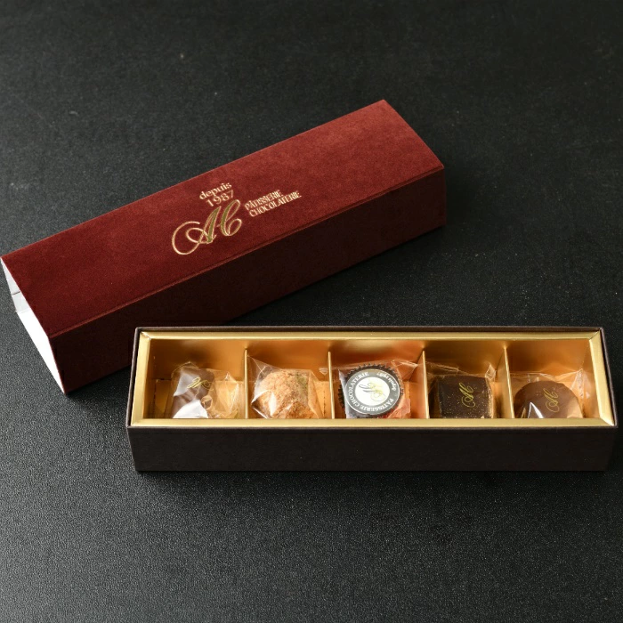 15種類以上のボンボンショコラの中から厳選の5個を詰め合わせ。カカオ生産者を支援する『カカオトレース』に賛同しバランスの良いチョコレートを使用。甘すぎずカカオの香りがとても豊かなショコラをベースにしています。