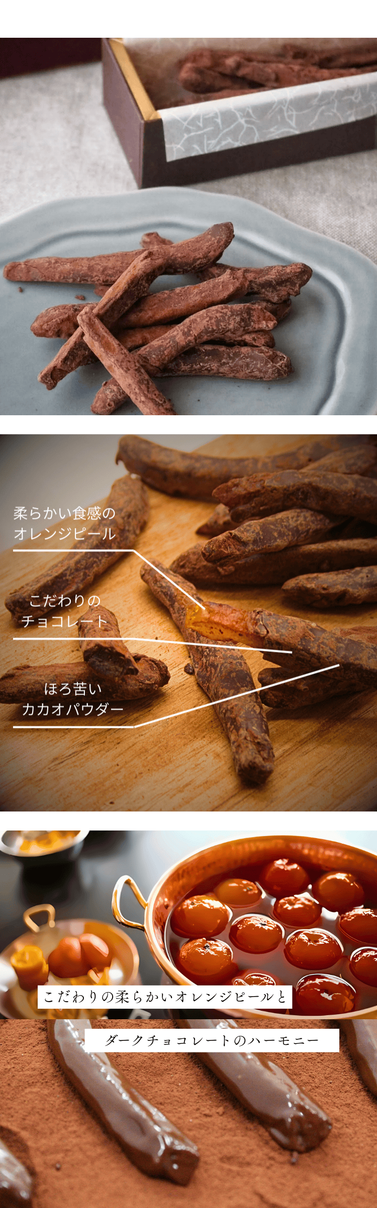 大口注文・法人のお問い合わせはこちらオレンジの皮を10日間シロップで煮、ゆっくりと糖分を浸みこませ、透明感のあるオレンジコンフィをスティック状に切り、1本ずつチョコレートコーティングしココアをまぶしました。 オレンジのもつほろ苦さと洗練されたチョコレートの甘さのバランスは当店自慢の逸品です。