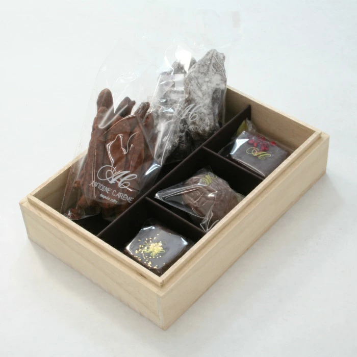 | 原材料 | 【オランジェット】オレンジ砂糖漬け(国内製造)、チョコレート、ココアパウダー/香料、(一部に乳成分・オレンジ・大豆を含む) 【ポンム】 りんご(中国産)、砂糖、チョコレート(大豆を含む)、シナモン/漂白剤(亜硫酸塩) 【ボンボンショコラ】チョコレート(国内製造、ベルギー製造)、生クリーム、砂糖、ヘーゼルナッツ、バター、水飴、カカオバター、ピスタチオ、アーモンド、パッションフルーツピューレ、フランボワーズピューレ、洋酒、クルミ、ミント、カカオマス、コーヒー、紅茶、転化糖、蜂蜜、トンカ豆、フランボワーズパウダー、バニラビーンズ、シナモンパウダー、卵白、食塩/乳化剤、香料、トレハロース、ゲル化剤(ペクチン:りんご由来) |
