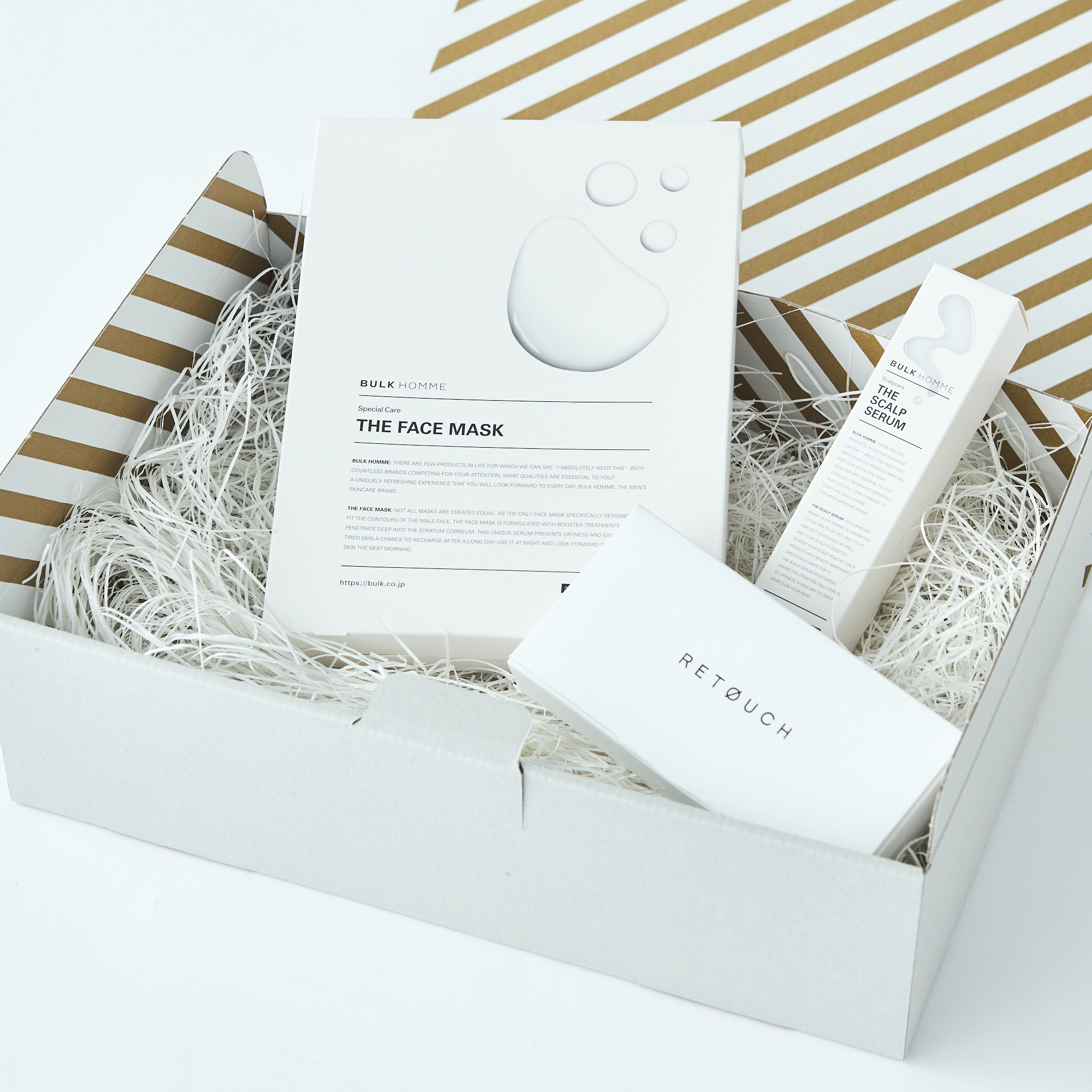 大口注文・法人のお問い合わせはこちらフェイスマスクとリップクリームと頭皮用美容液をセットにしました。 「THE FACE MASK」は5枚セットで効率的に水分を補給し、肌をいたわります。 「RETØUCH」の高保湿リップクリームは、スクワランやアルガンオイル配合で自然な仕上がりを実現しました。 頭皮用美容液はノンウォーター処方で潤いと美容成分を角質層まで浸透します。