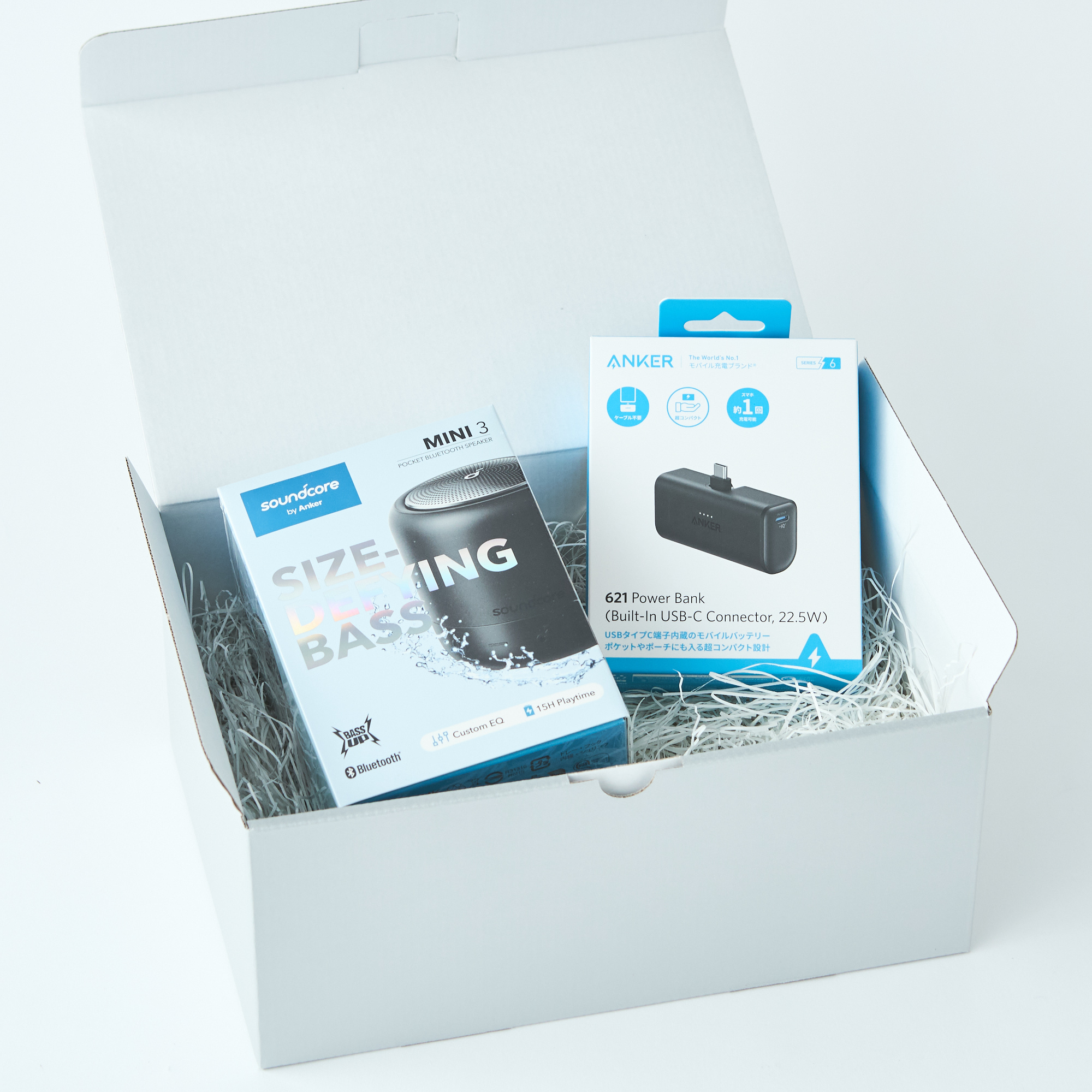 大口注文・法人のお問い合わせはこちらケーブル不要で手軽に充電できるモバイルバッテリーと、パワフルな低音を実現するコンパクトBluetoothスピーカーをセットしました。 モバイルバッテリーはLightning端子とUSB-C端子から選択できます。 スピーカーは、防水仕様&重低音設計でどこでも高音質を楽しめます。