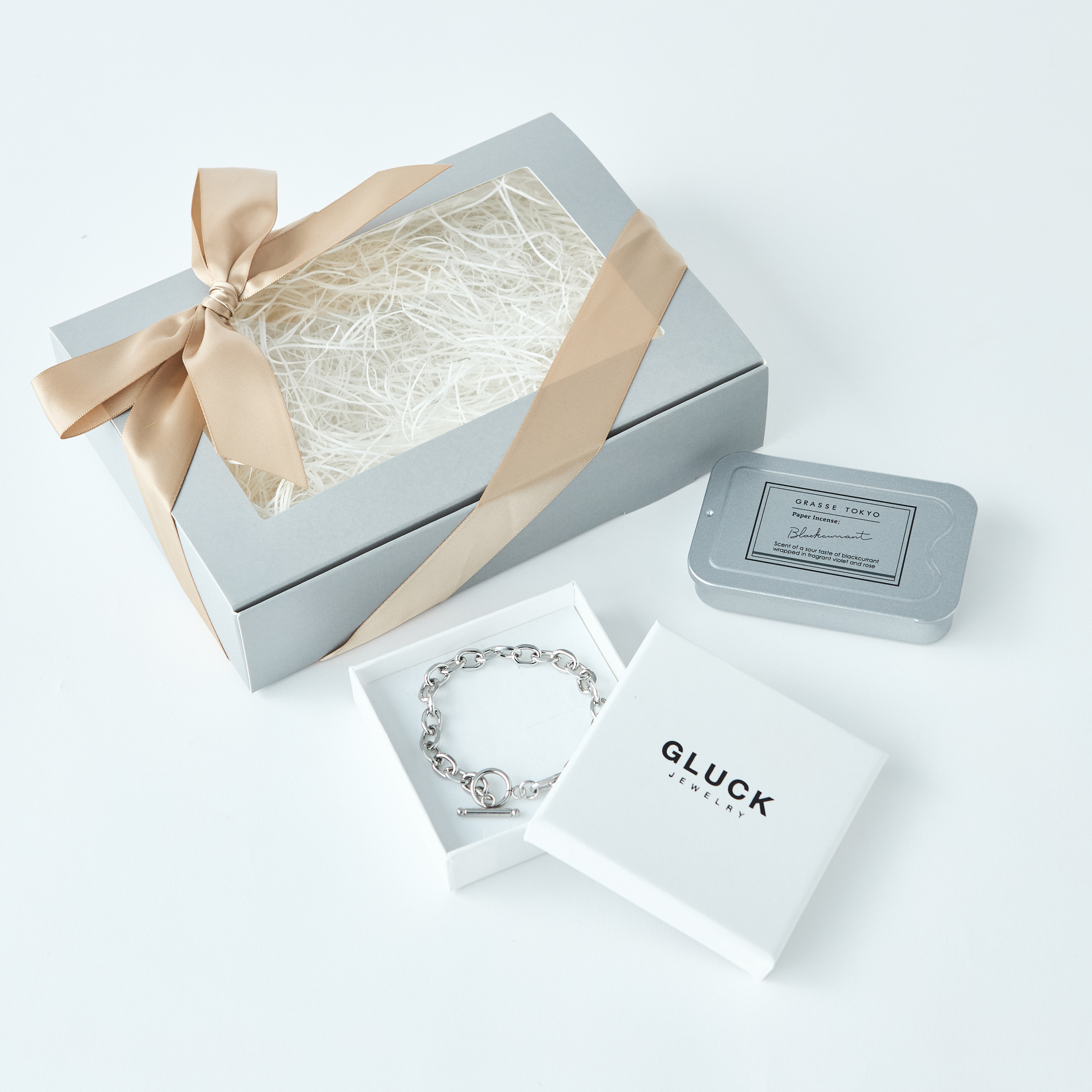 洗練されたカットデザインが魅力のスタイリッシュなブレスレットと、香りを楽しめる紙のお香をセットにしました。ブレスレットはどんなスタイルにも合います。華やかなブラックカラントの香りが広がるお香は、リラックスタイムにおすすめです。